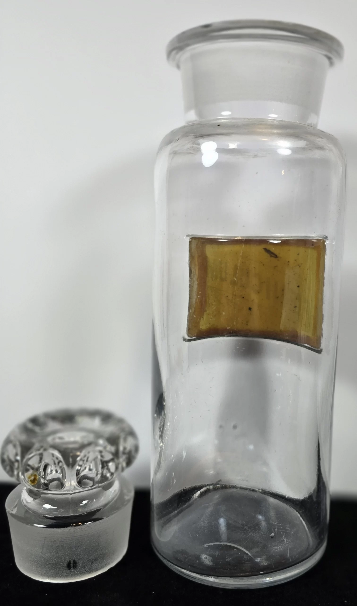 Excellent condition. Glass is clear with only minor internal residue and light shelf wear on the base. Stopper fits snugly with intact ground joint. Label is vivid and clean with no flaking or discoloration.