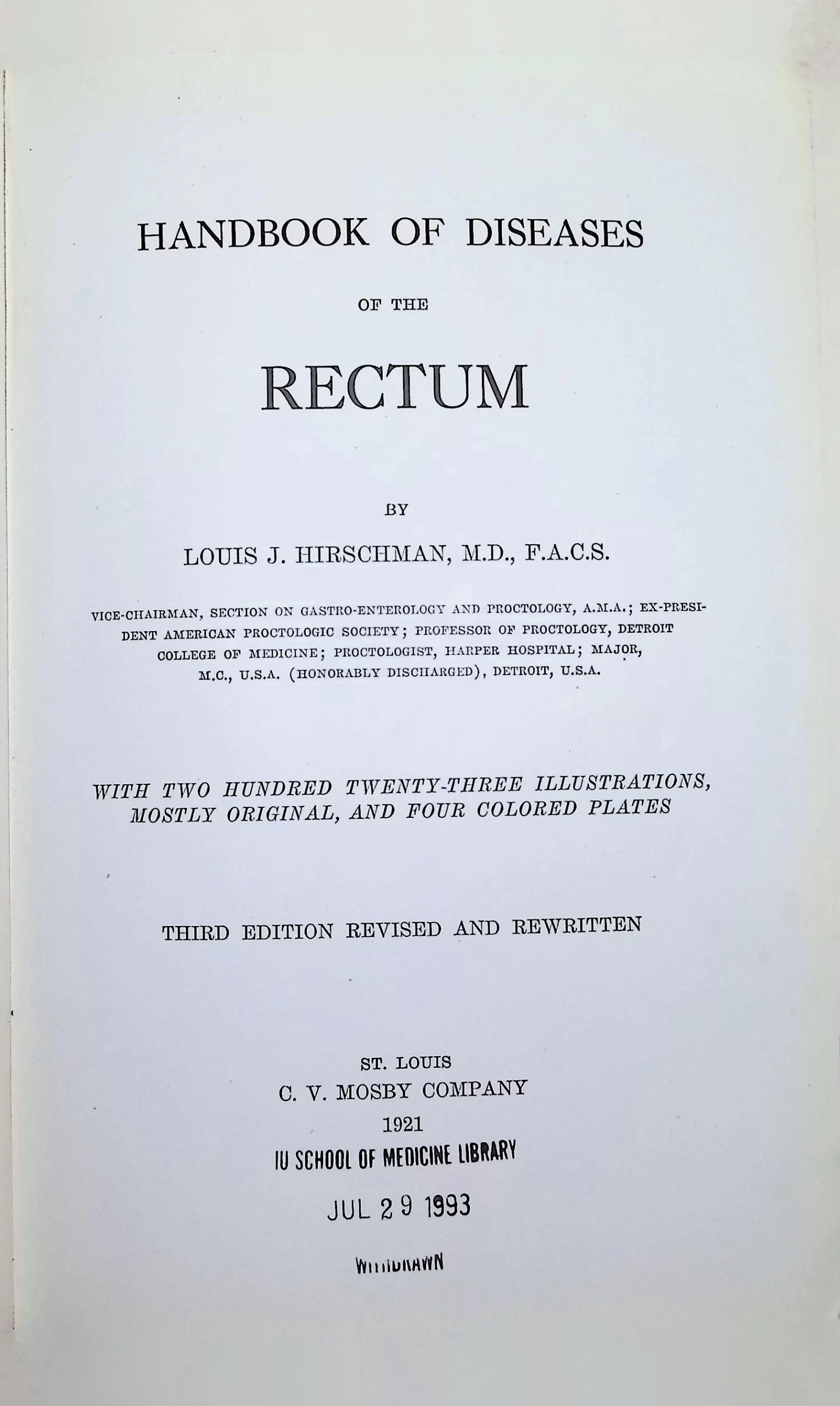 This 1921 surgical reference, written by Louis J. Hirschman, M.D.—a leading figure in early 20th-century American proctology—offers a thorough and graphic examination of rectal diseases and their treatment. As Vice-Chairman of the A.M.A.’s Section on Gastroenterology and Proctology and professor at Detroit College of Medicine, Hirschman compiled a wealth of personal clinical experience into this compact yet richly illustrated volume.