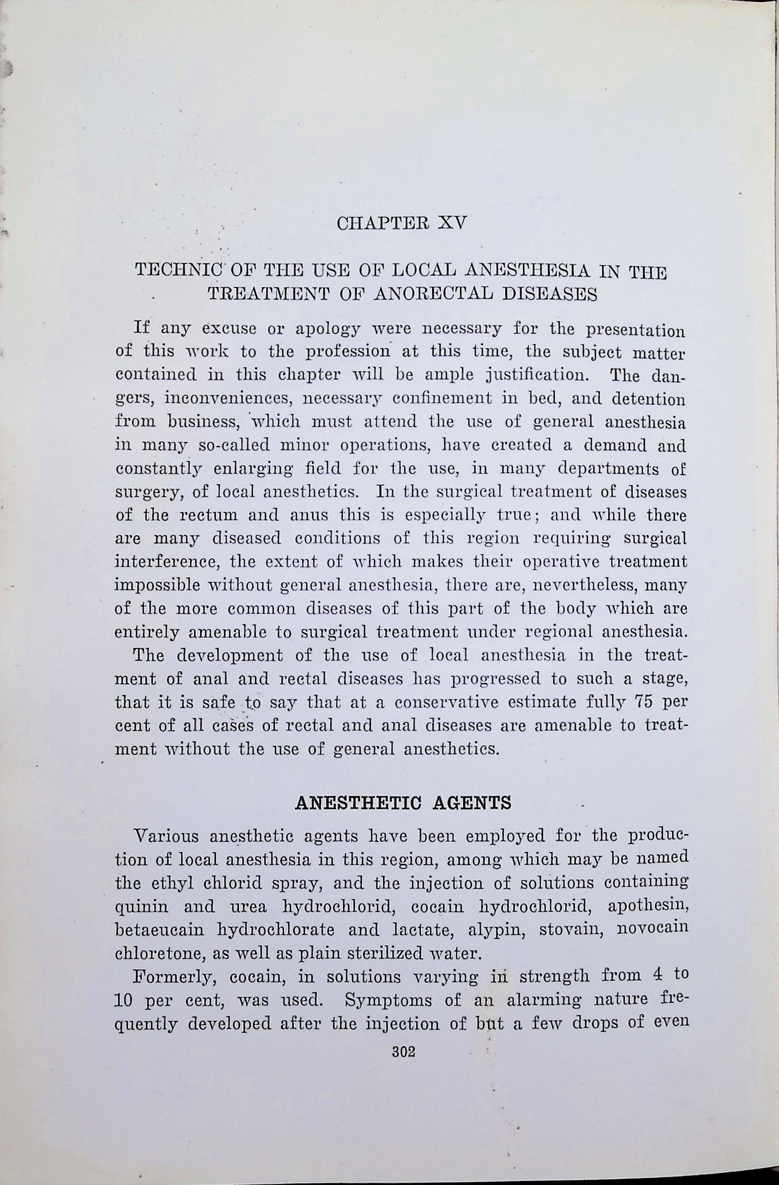 Notably, the anesthesia section describes the use of cocaine hydrochloride (4–10%) for local anesthesia, reflecting the standards of care of the era.