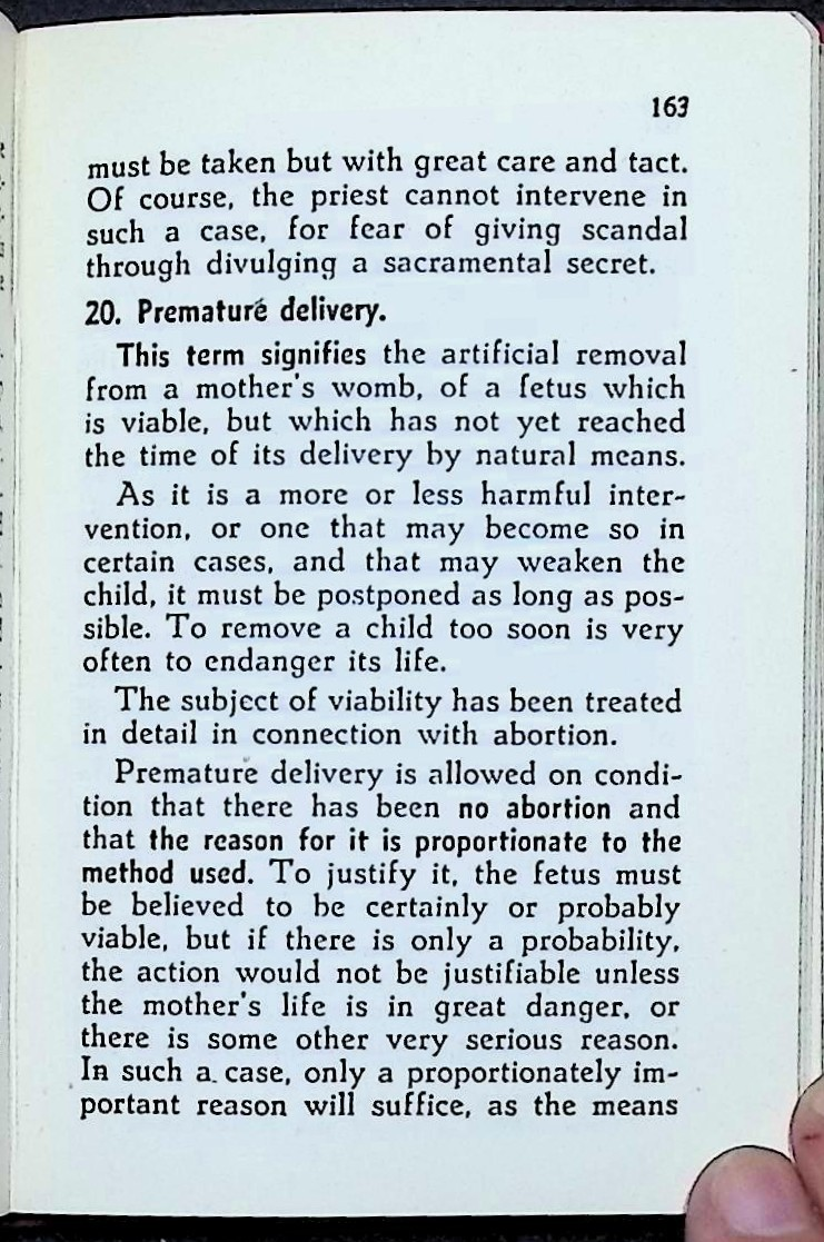 Published in 1950, the handbook reflects a period of rapidly evolving medical capability — including improved surgical techniques, antibiotic availability, and expanding obstetric interventions — alongside strict moral boundaries. The treatment of abortion, indirect therapeutic procedures, and the safeguarding of sacraments showcases a worldview deeply rooted in Thomistic moral theology, particularly the principle of double effect.