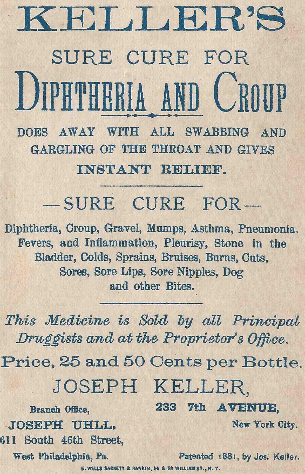 In the late 19th century, diphtheria was a terrifying and often fatal disease for children. Before vaccines and antibiotics, desperate families turned to patent medicines that claimed sweeping cures. Keller’s Sure Cure was one of many concoctions sold through wordy advertisements, often promising impossible results.