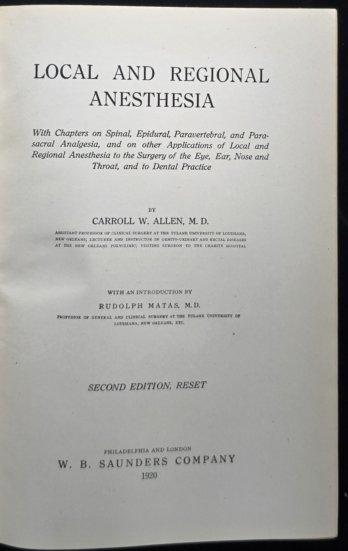 • Dr. Rudolph Matas, who introduced the book, is considered the father of intravenous regional anesthesia (“Bier block”) in America.