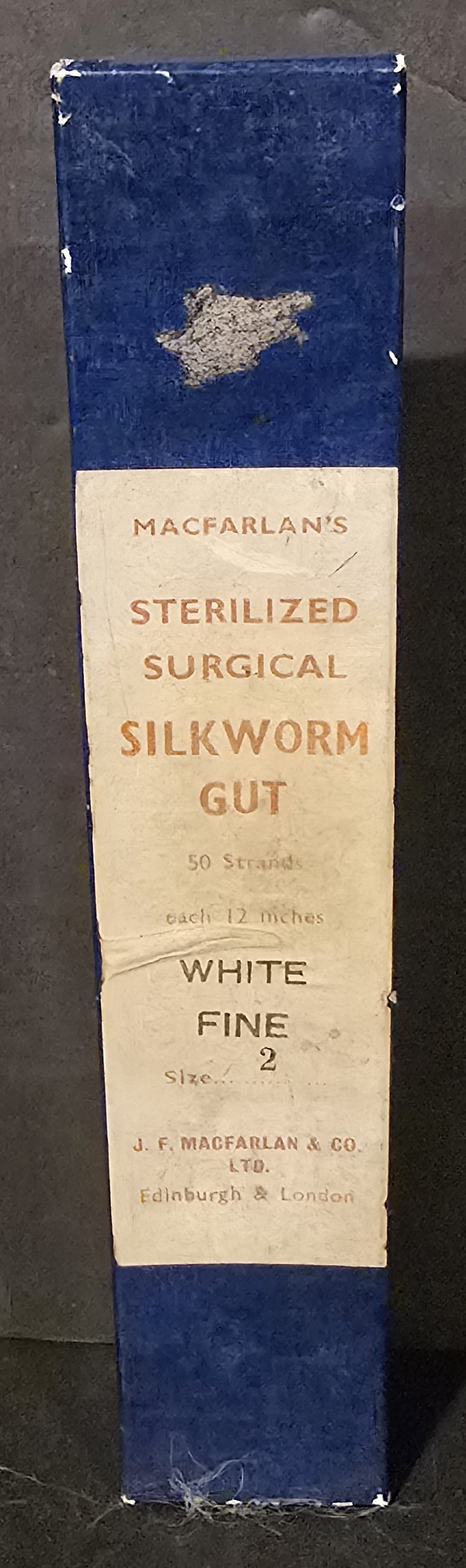Silkworm gut sutures were produced from the processed silk glands of the silkworm and were widely used in surgery during the late nineteenth and early twentieth centuries. Unlike softer silk sutures, silkworm gut provided a strong, smooth, and relatively non-absorbable suture material, making it especially useful for skin closure and external surgical sutures.