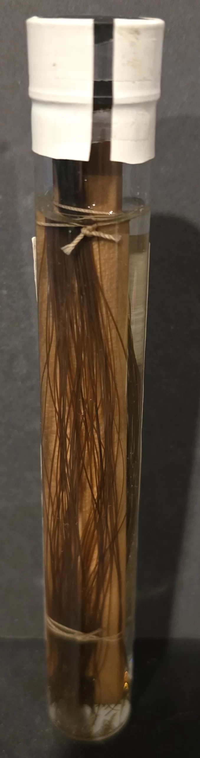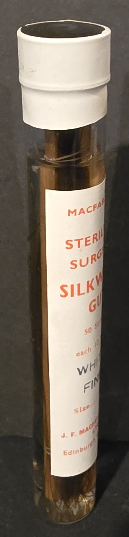 This glass tube contains sterilized surgical silkworm gut sutures manufactured by J. F. Macfarlan & Co., Ltd. of Edinburgh and London. The label identifies the contents as “Macfarlan’s Sterilized Surgical Silkworm Gut”, consisting of 50 strands, each 12 inches long, marked White Fine, Size 2.