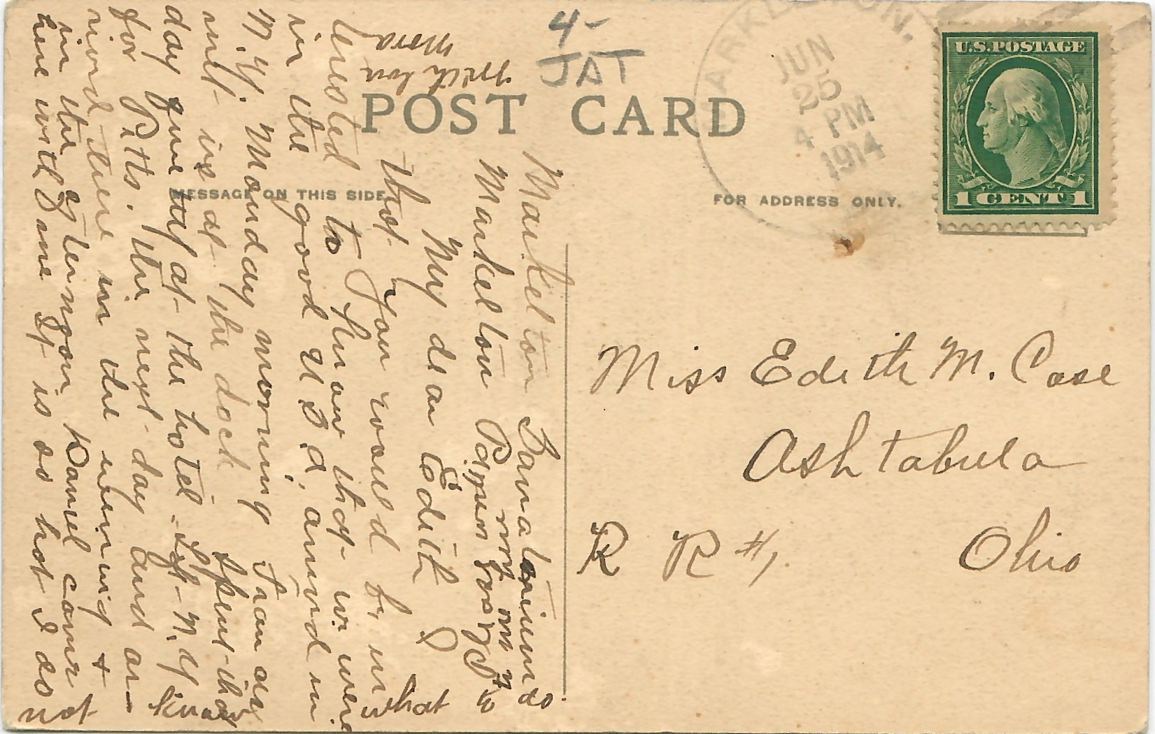 The postcard is postmarked June 25, 1914 and bears a one-cent U.S. stamp. It includes a handwritten note referencing travel, hotels, and daily life, offering a snapshot of early 20th-century correspondence.