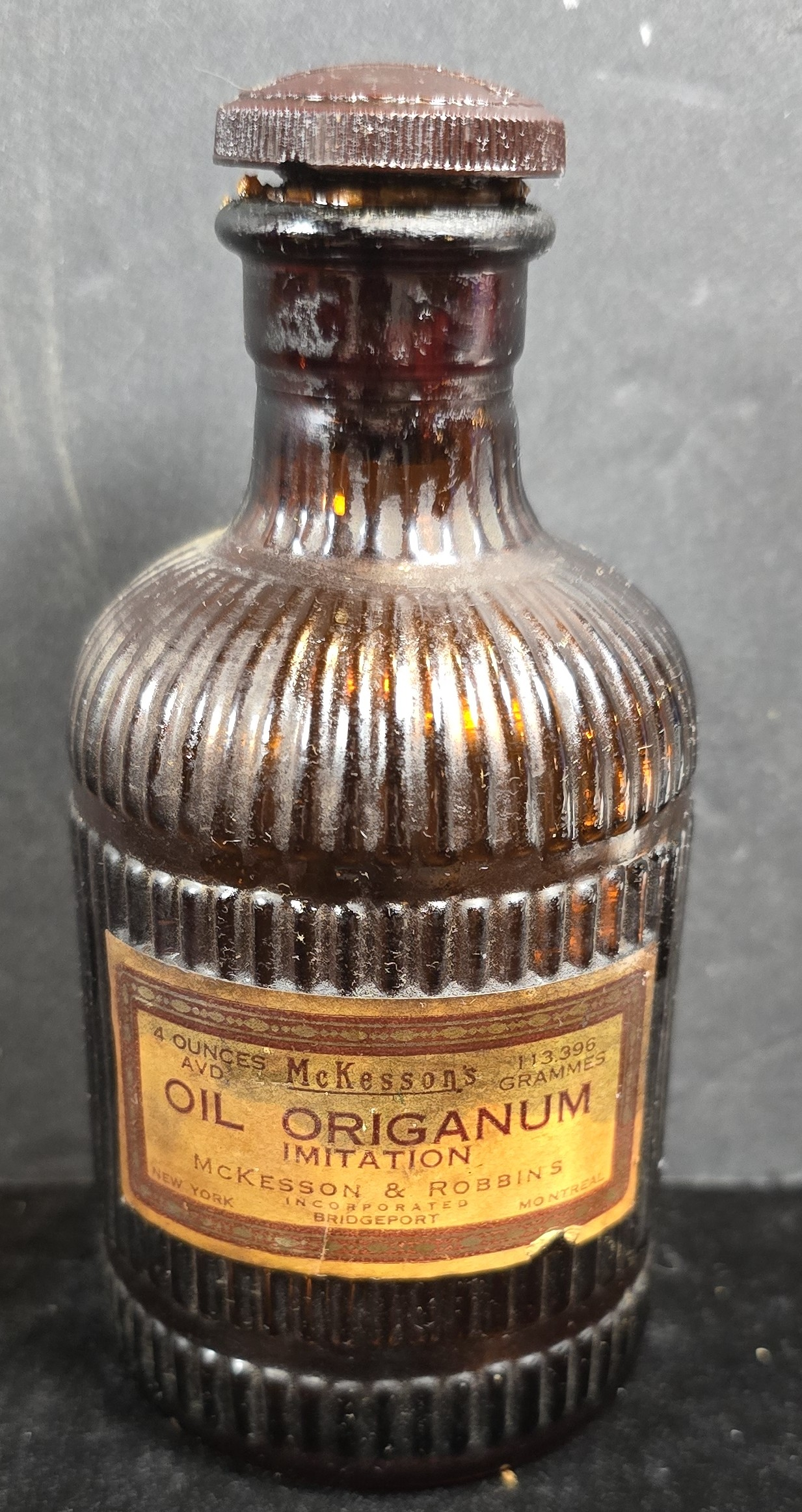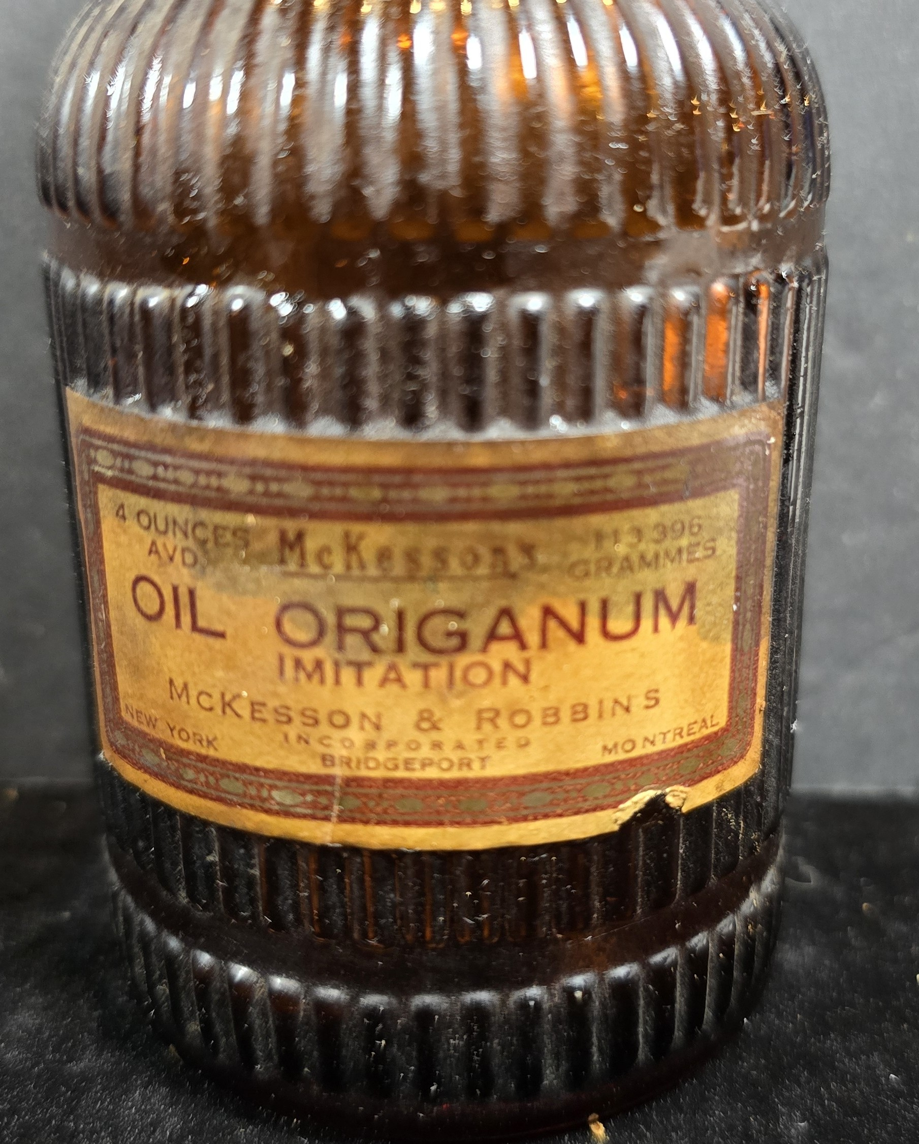 “OIL ORIGANUM — IMITATION. McKesson & Robbins, Incorporated, New York, Bridgeport, Montreal.”
