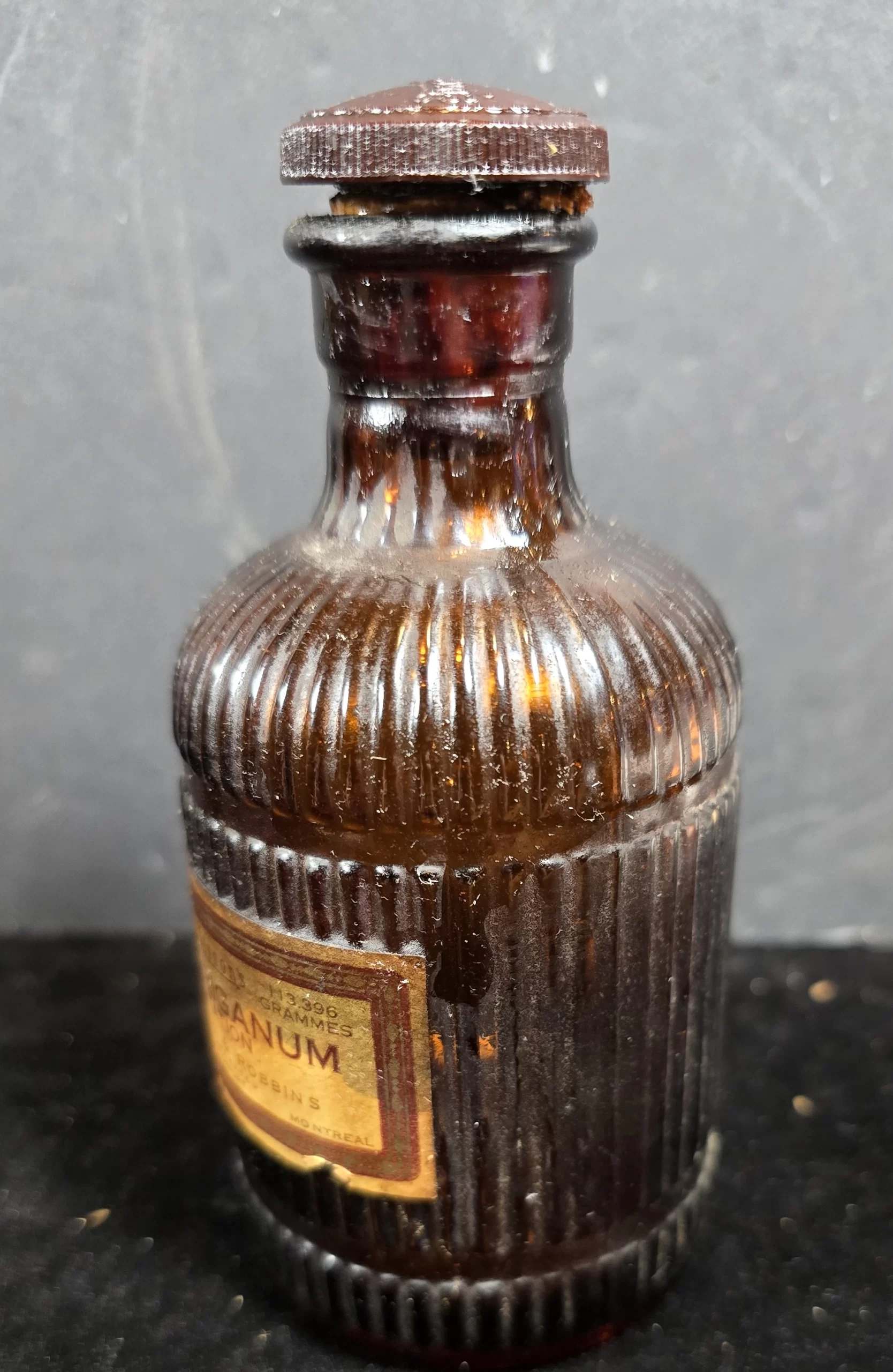 This bottle represents the practical, everyday side of American pharmacy — the sort of ingredient used constantly in compounding rooms, liniment formulas, and veterinary mixtures. The “imitation” label adds historical interest as a reflection of early regulatory pressure and honest disclosure in medicinal manufacturing. The ribbed amber bottle, intact cap, and legible label make this an excellent example of McKesson’s workhorse packaging style.