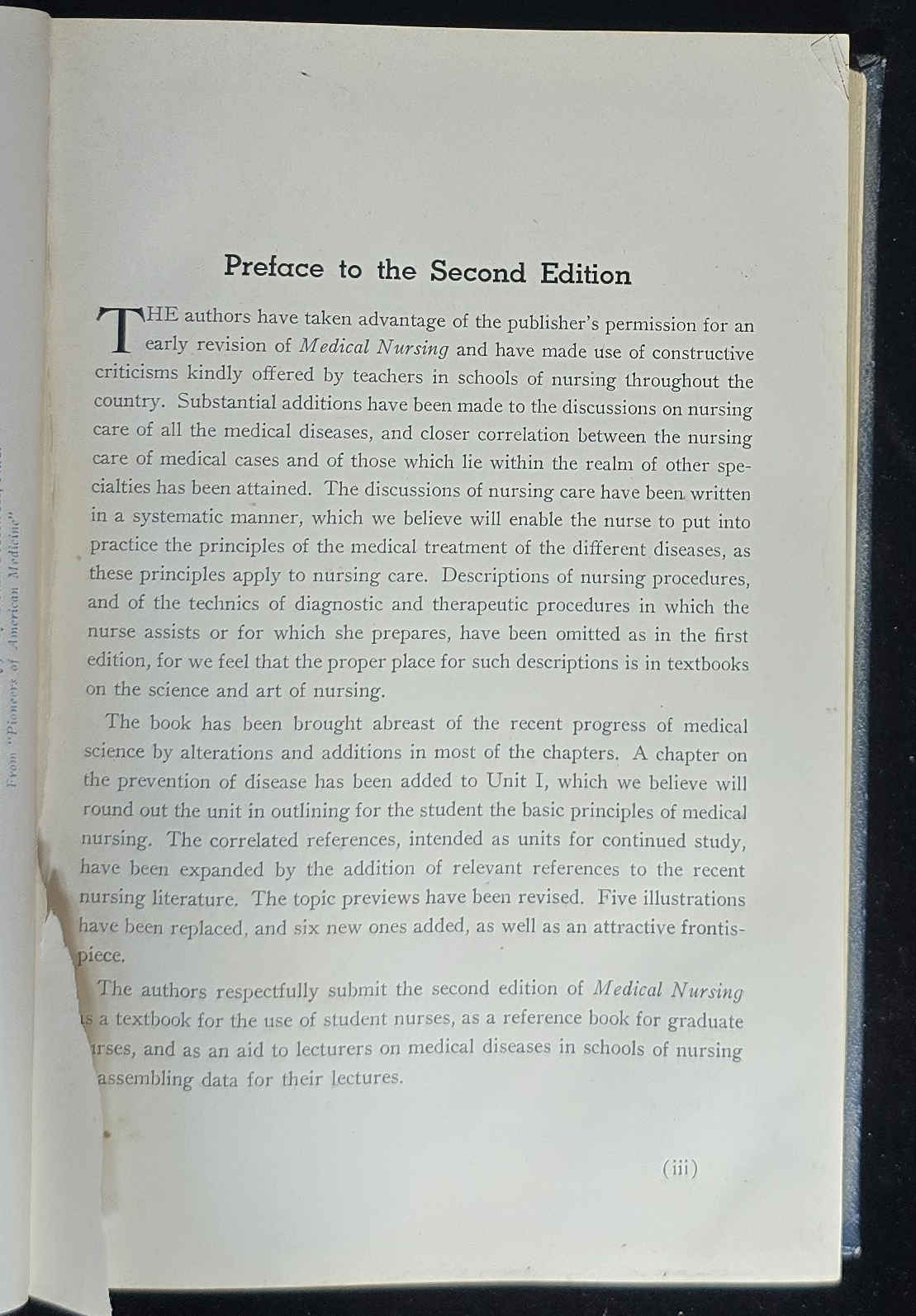 During the first half of the 20th century, nursing education underwent a rapid professional transformation. Textbooks like Medical Nursing helped standardize instruction in hospitals and nursing schools across the United States. This second edition, published during the World War II era, includes updated material on prevention and diagnosis, reflecting both medical advances and the urgent demand for trained nurses.