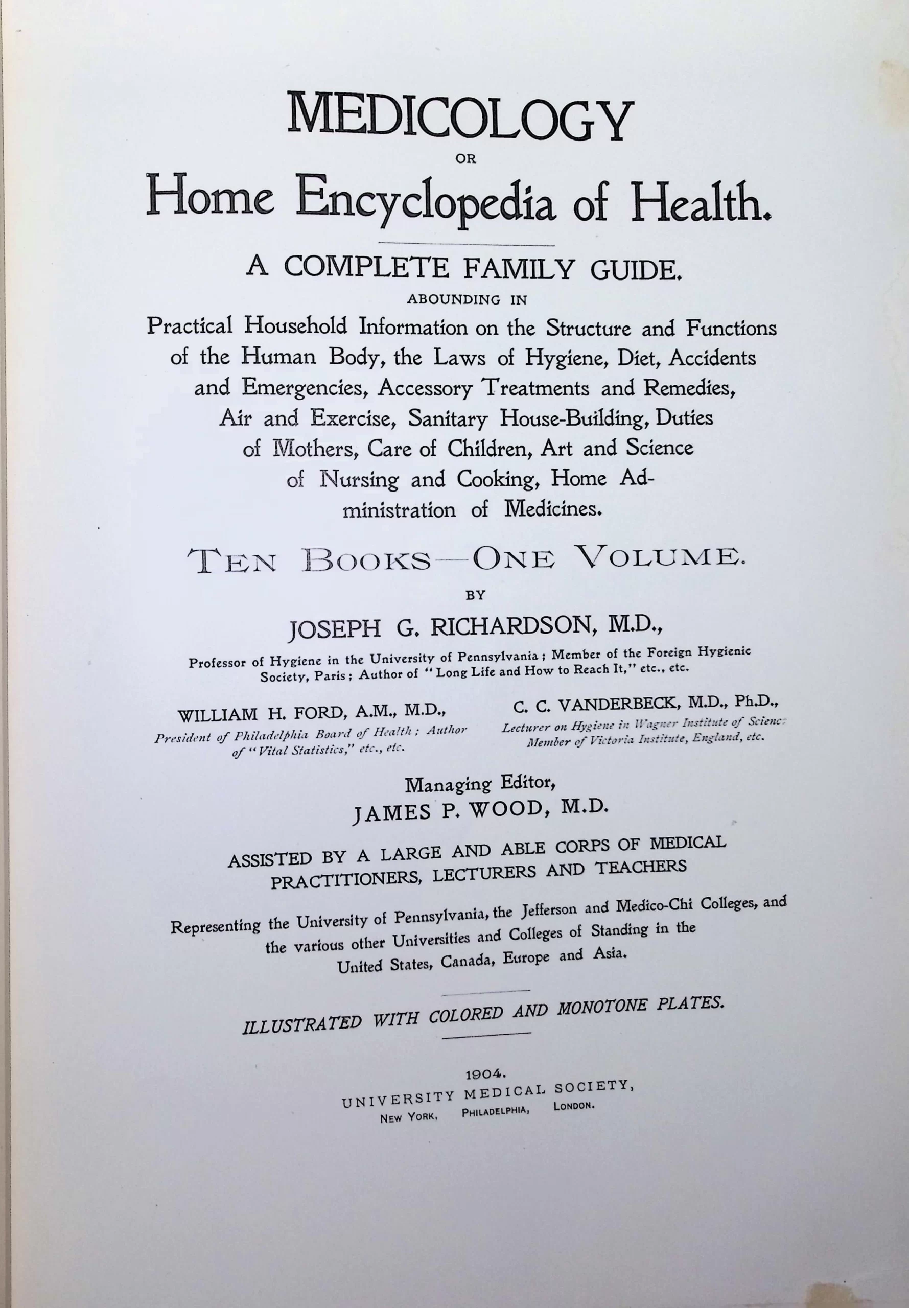 This monumental 1904 edition of Medicology: Or Home Encyclopedia of Health is a massive, richly illustrated volume designed to serve as a comprehensive medical guide for the layperson. Subtitled A Complete Family Guide, the book spans 10 detailed sections and nearly 1,400 pages, covering anatomy, hygiene, disease, home remedies, child-rearing, exercise, household safety, and more. Authored and edited by a team of 20 physicians and medical educators—many associated with the University of Pennsylvania and Jefferson Medical College—Medicology stands as a turn-of-the-century attempt to democratize medical knowledge.