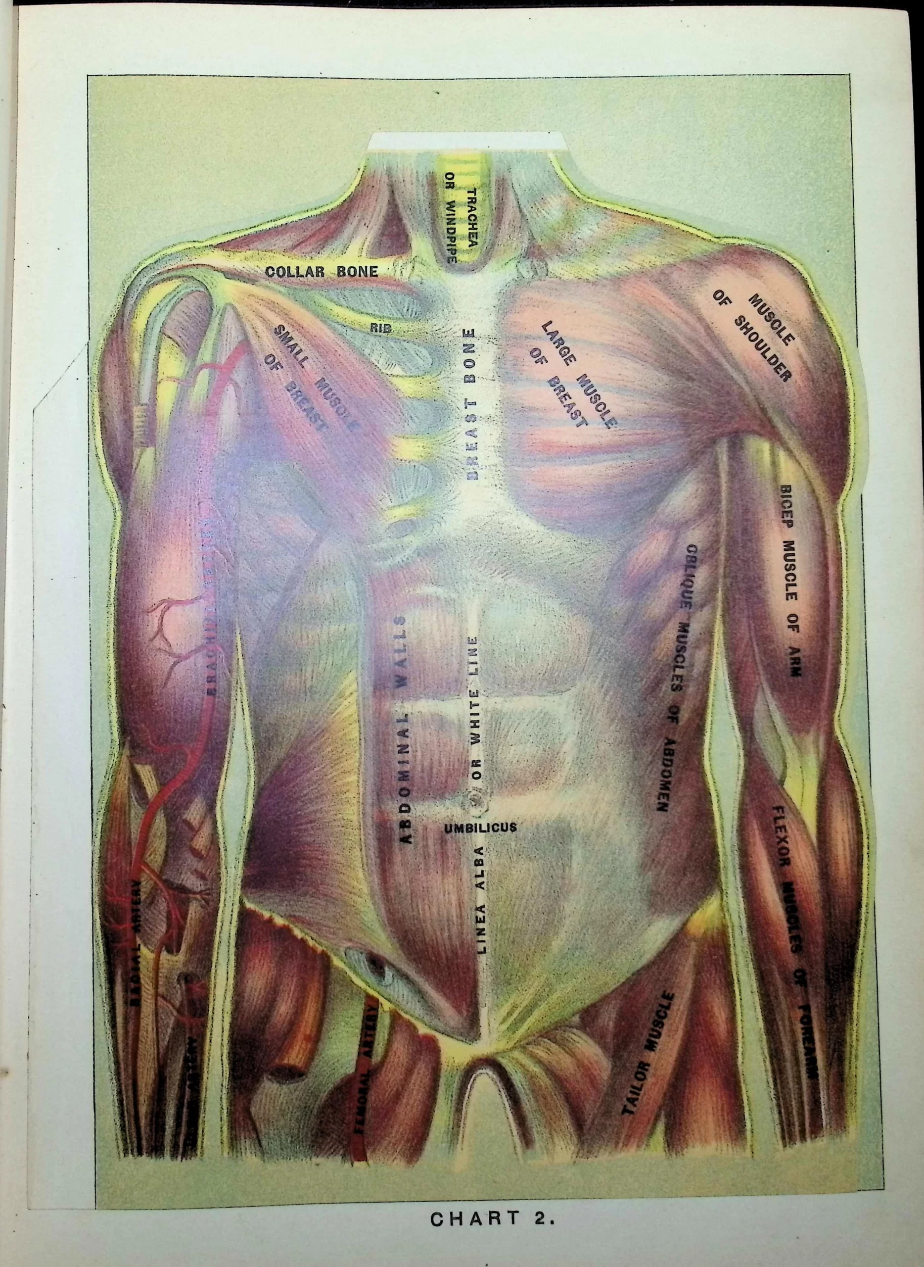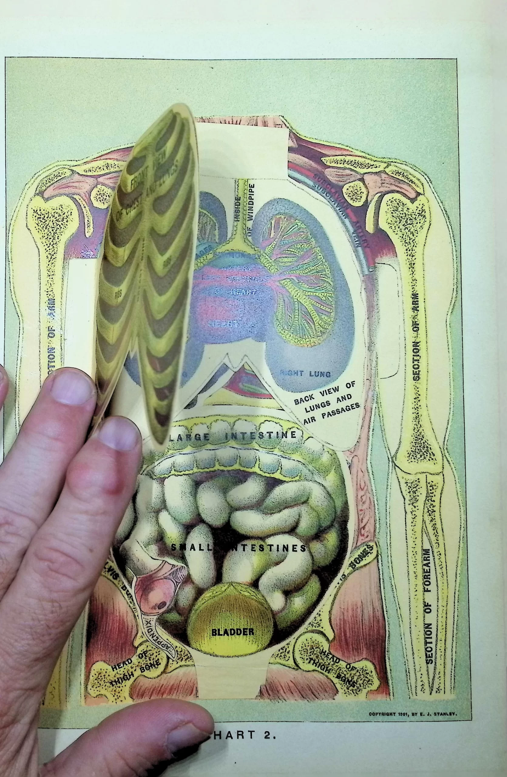 • Charts feature liftable flaps revealing muscle, skeletal, and organ systems.