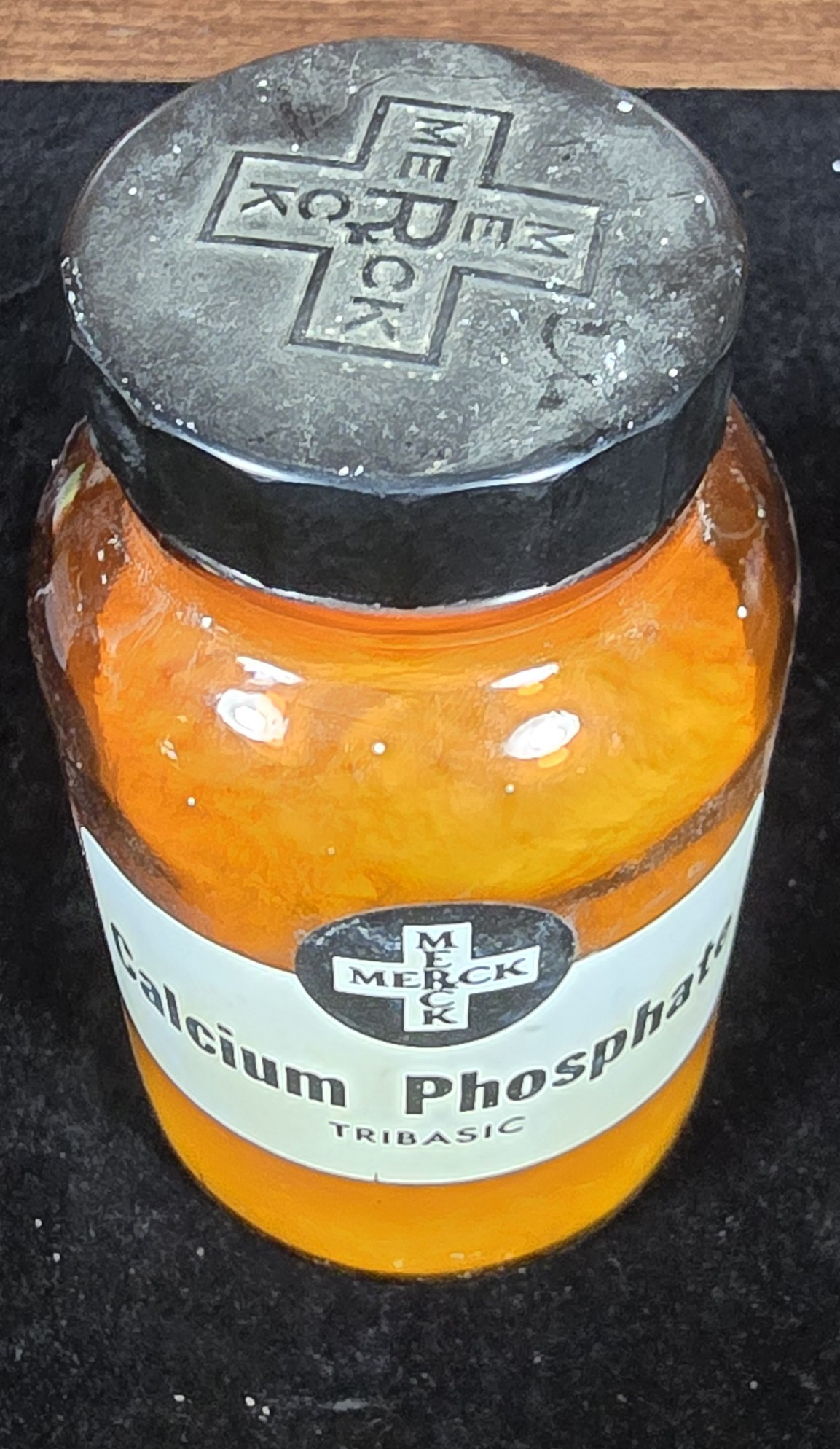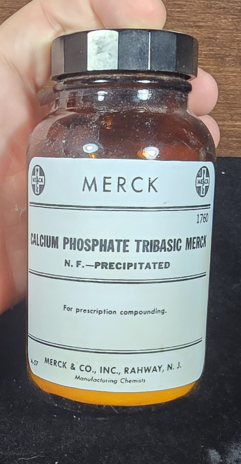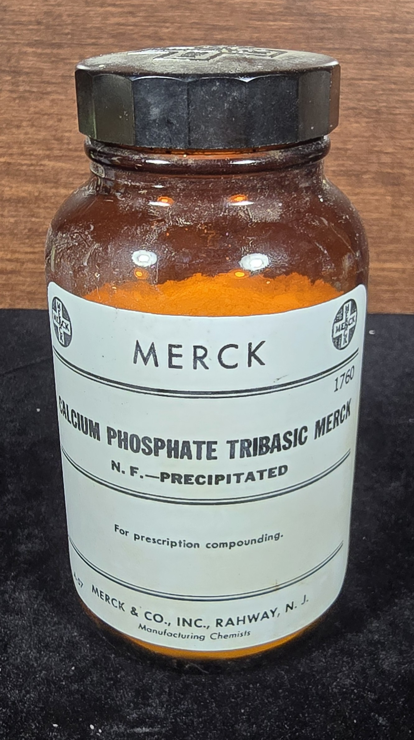 This amber glass apothecary bottle labeled “Calcium Phosphate Tribasic – N.F. Precipitated” was produced by Merck & Co., Inc., a long-standing pharmaceutical manufacturer based in Rahway, New Jersey. It was used for prescription compounding and likely dates from the mid-20th century, based on label design and branding.