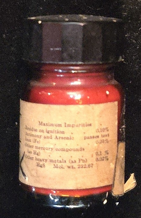 The compound is chemically known as HgS (mercuric sulfide), a historically important red pigment and medicinal substance. The embossed black Bakelite screw cap indicates mid-20th century production.