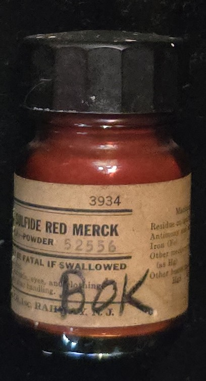 Amber glass bottle with intact original Bakelite cap. Labels are legible though show age wear, with handwritten inventory markings (“B2K”). Contents remain sealed and stable, with the vivid red powder clearly visible.
