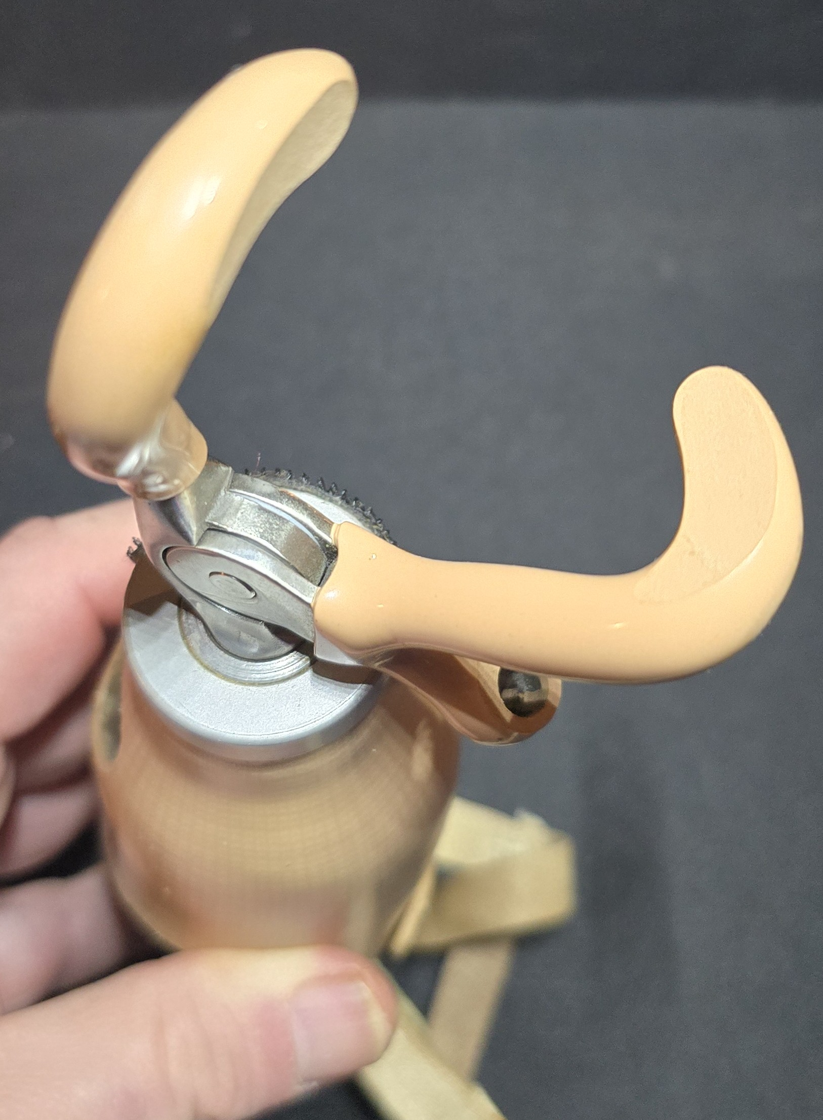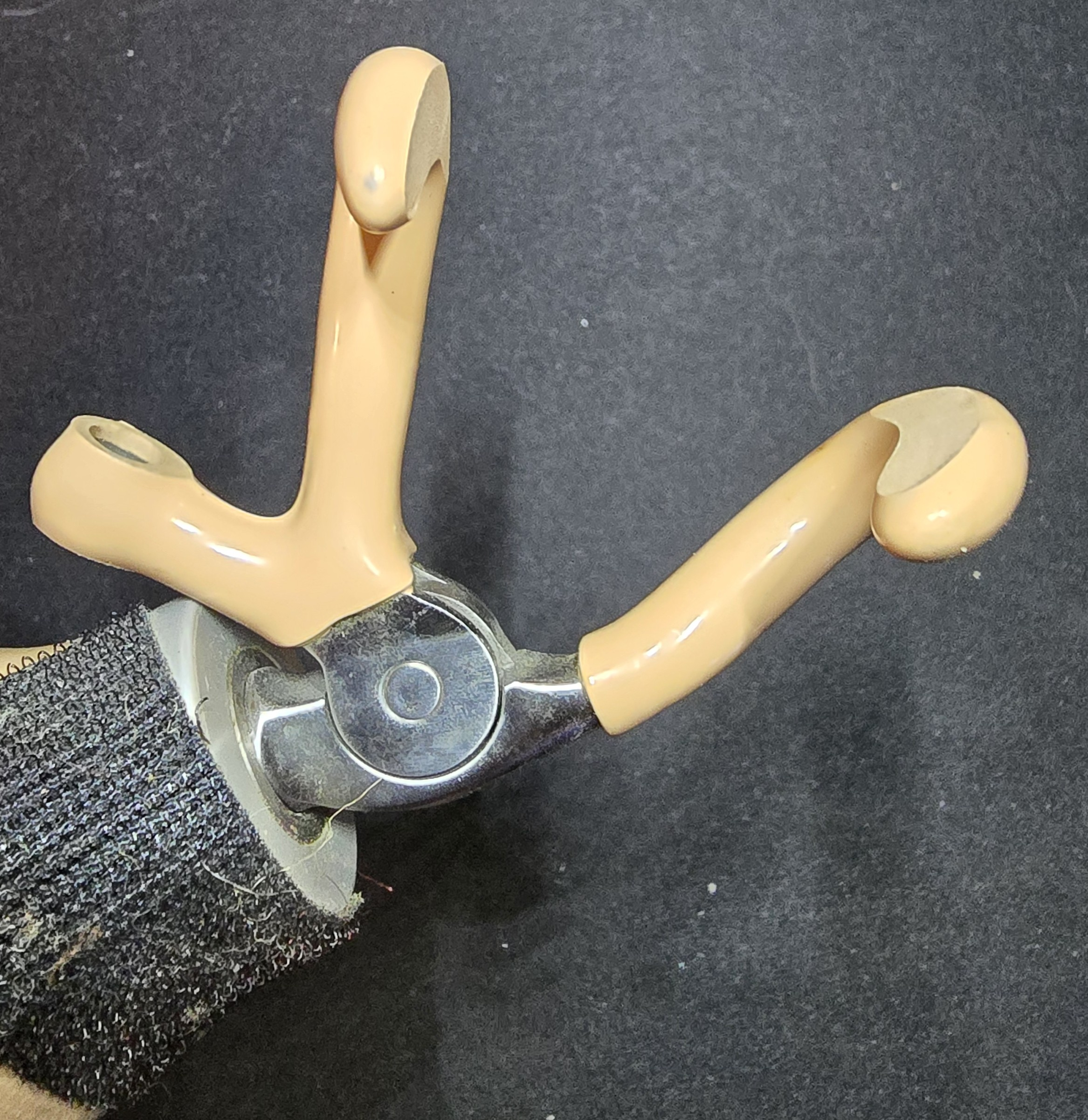 The terminal device consists of three curved, flesh-toned prongs mounted to a metal joint. The mechanism appears cable-driven, designed to open through harness tension and close via spring return. The prongs show wear consistent with functional use.