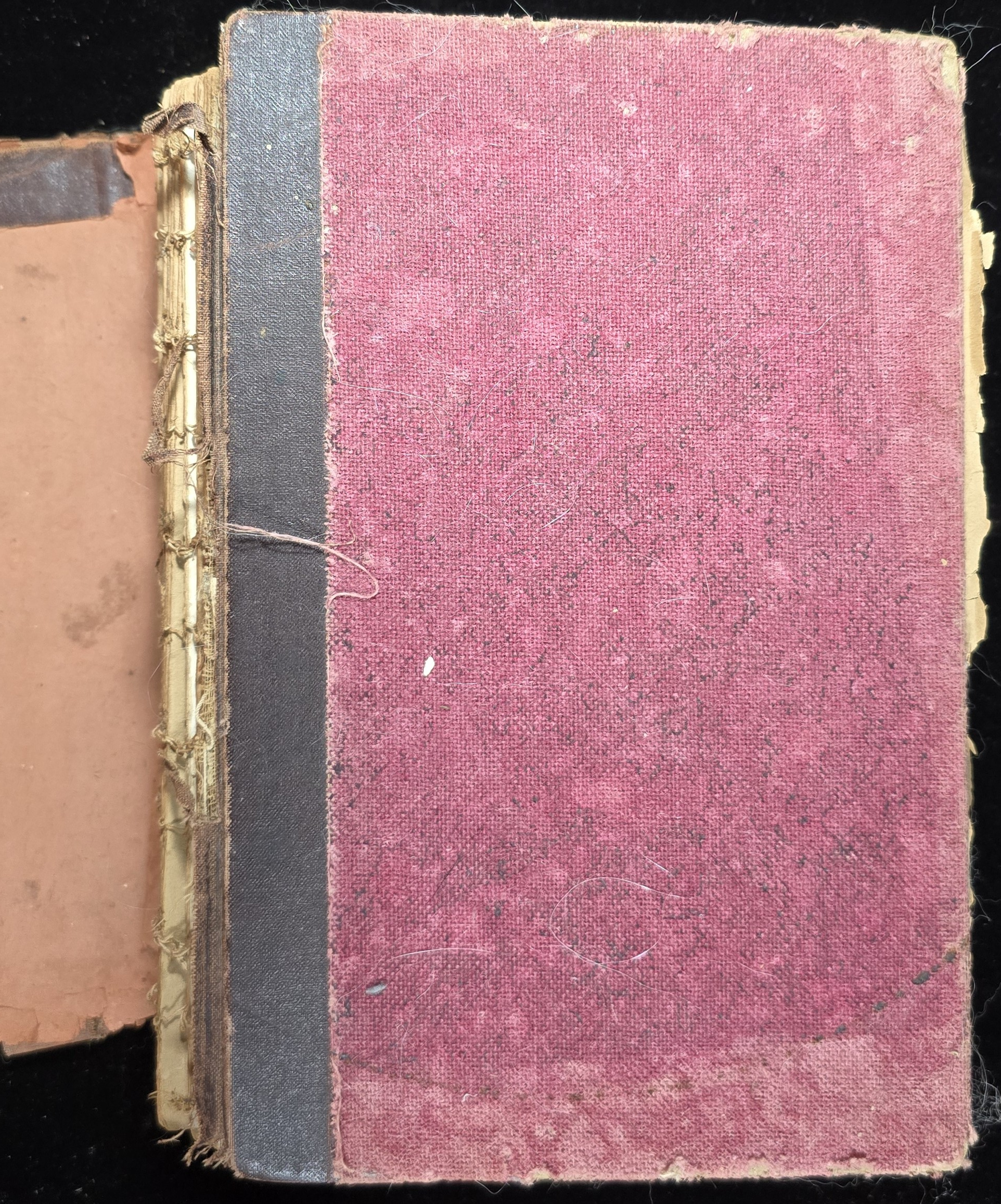 Poor. The spine is heavily frayed, the covers are loose, and the inner binding is exposed. Several pages are detached or fragile. The text remains legible throughout.