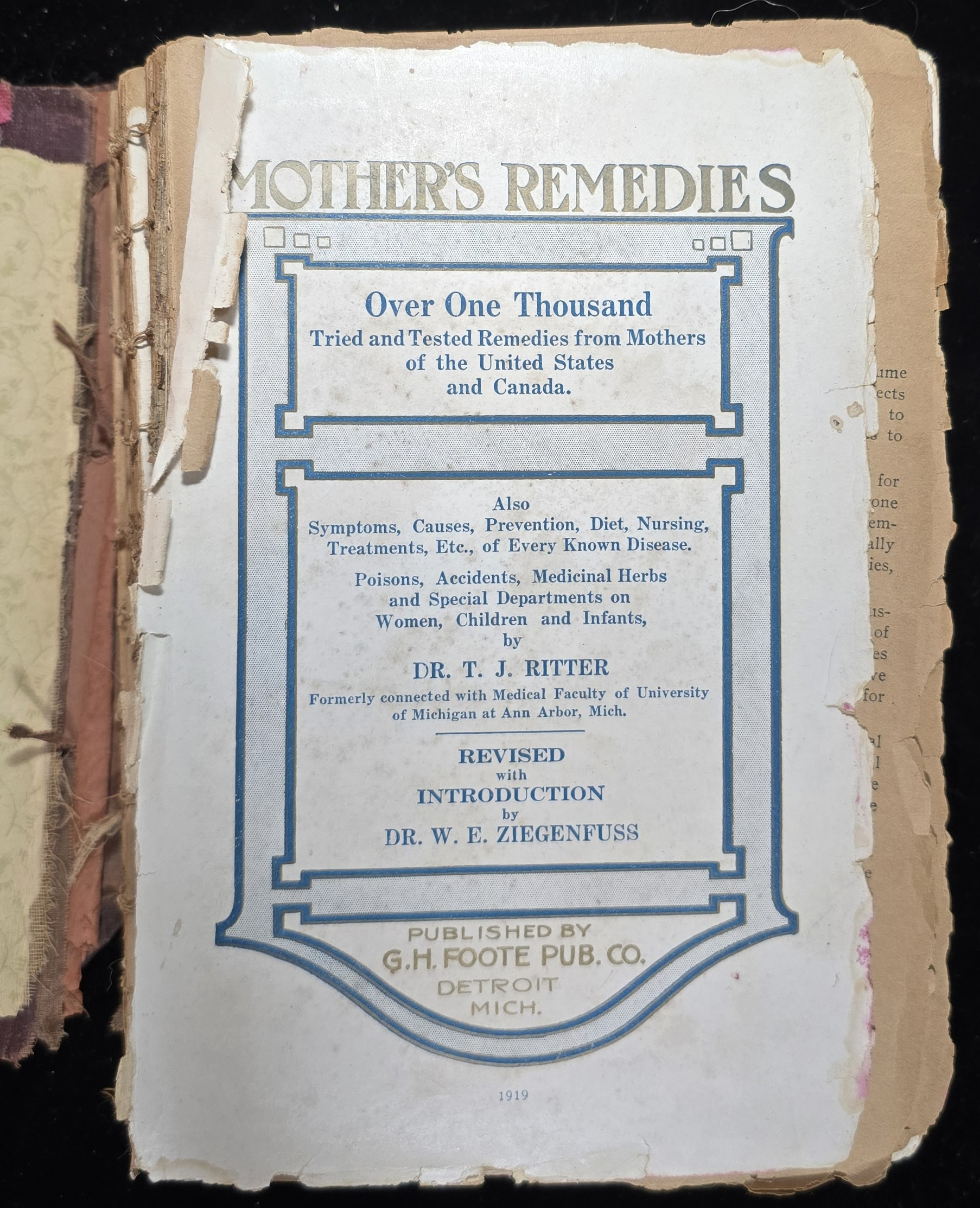 Mother’s Remedies, compiled by Dr. Thomas Jefferson Ritter and revised by Dr. W. E. Ziegenfuss, is a quintessential example of early 20th-century domestic medical literature. Published in 1919 by G.H. Foote Pub. Co. in Detroit, it aimed to be a comprehensive, family-oriented medical guide—offering over a thousand tried-and-tested home remedies contributed by women across the United States and Canada.