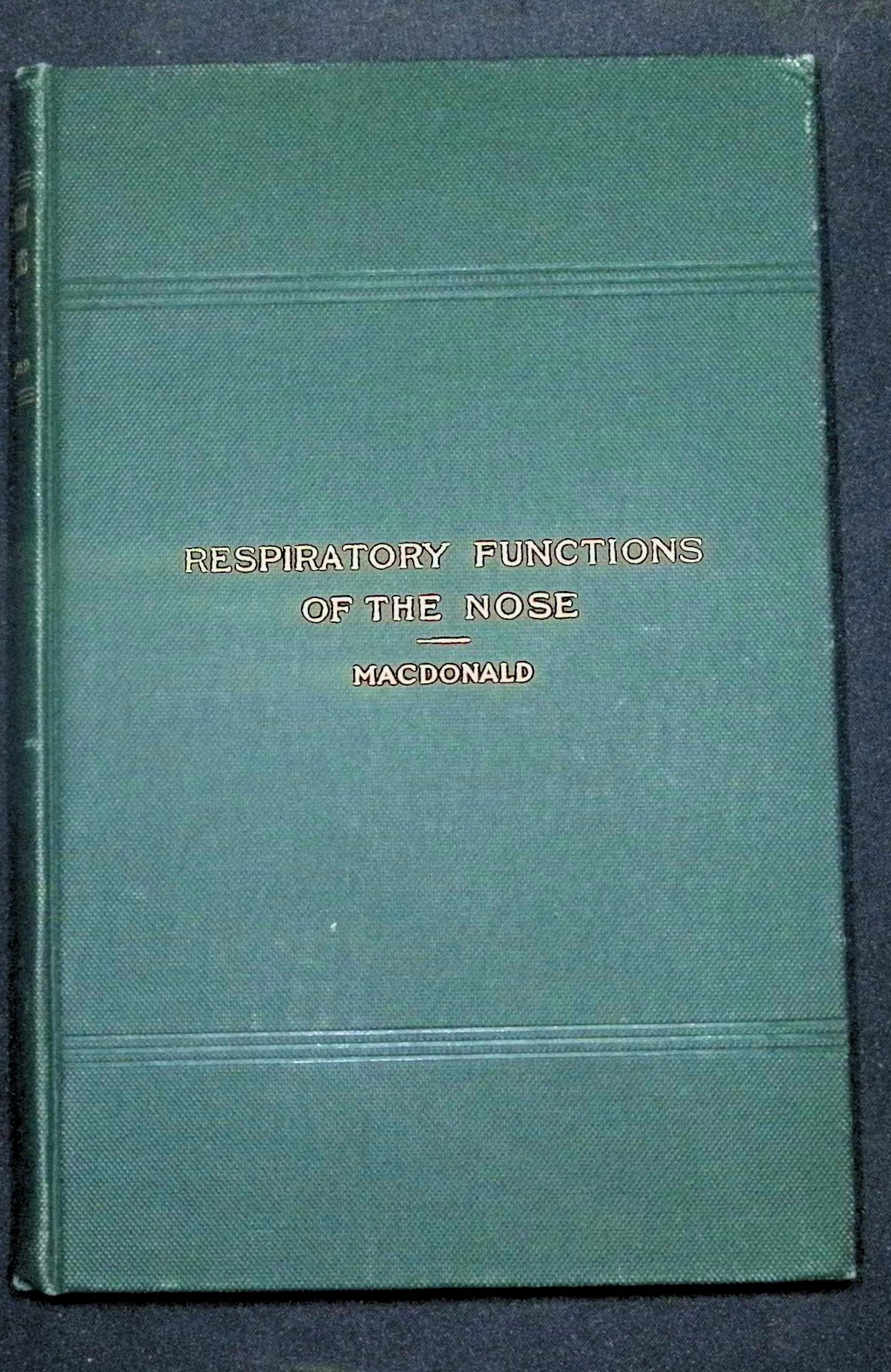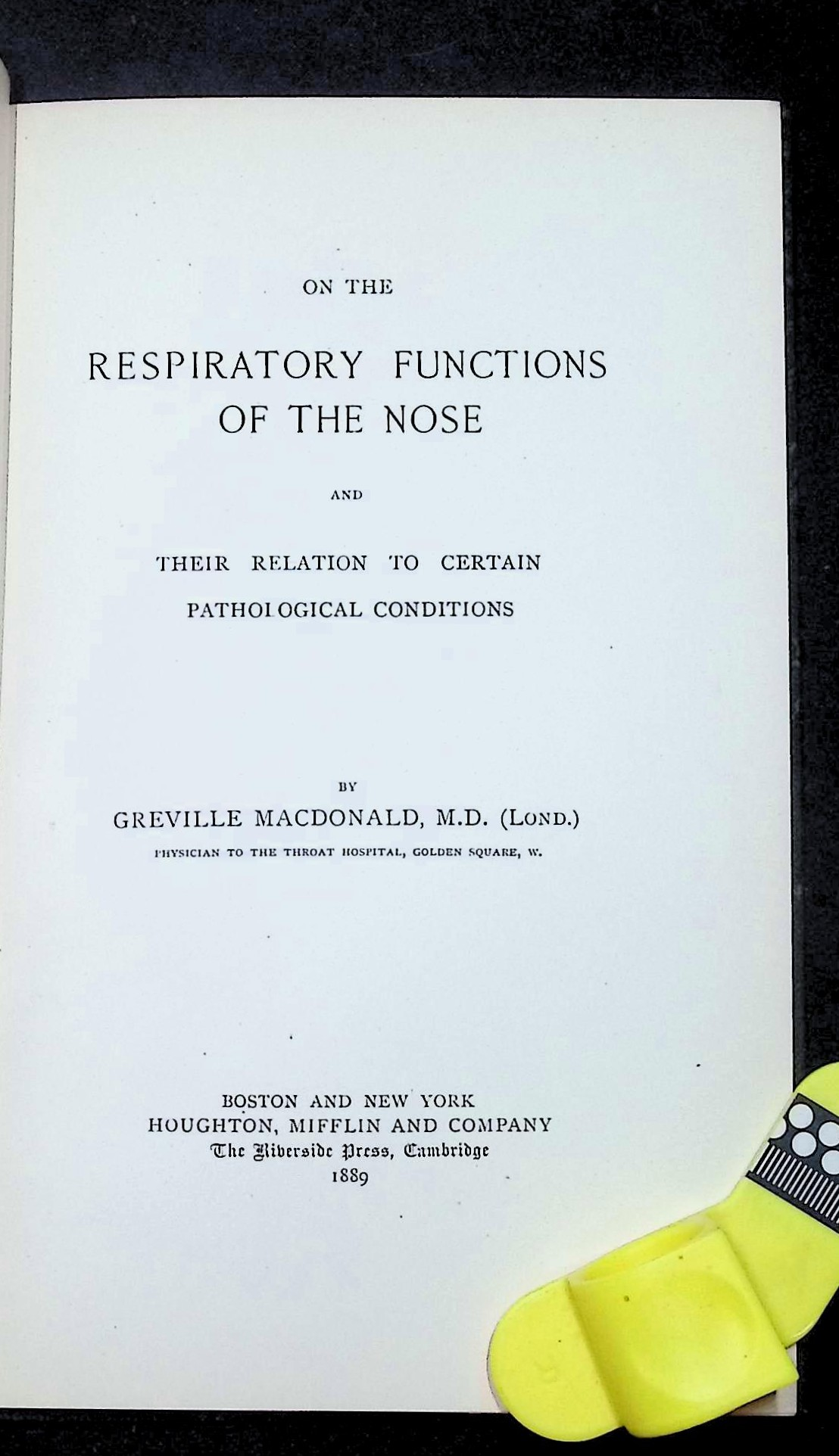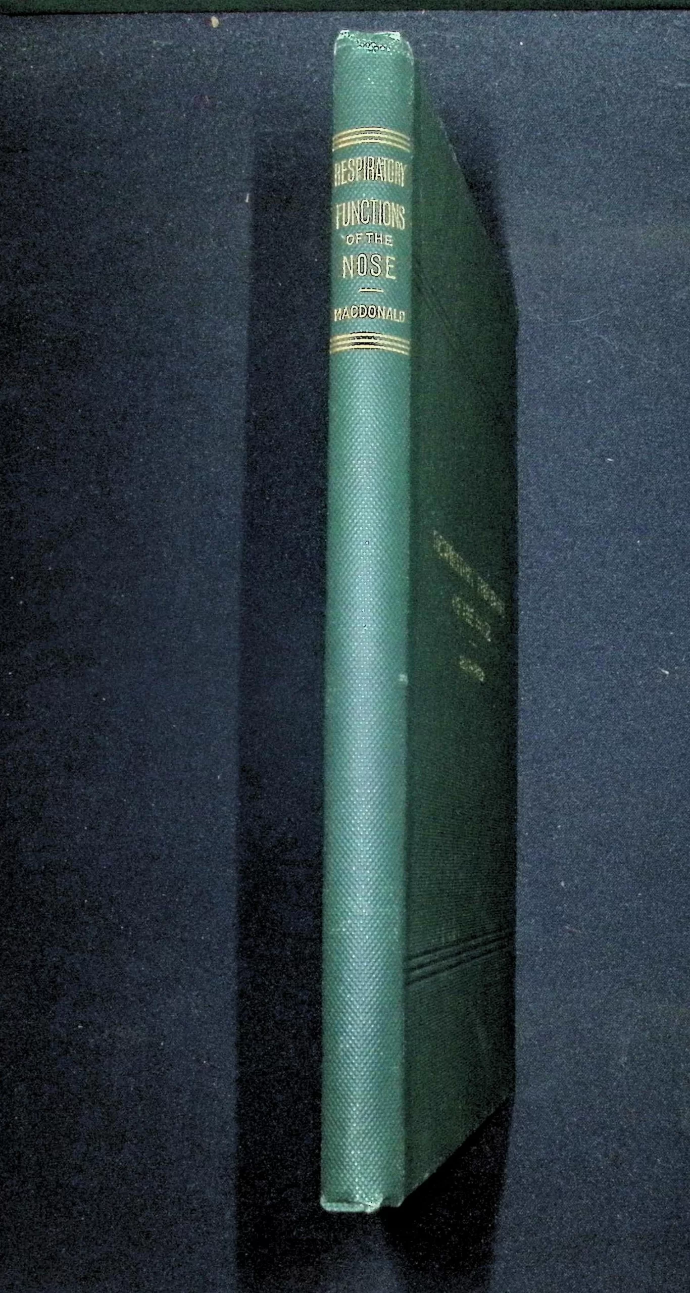 1889 cloth-bound book titled On the Respiratory Functions of the Nose by Greville Macdonald with experimental illustrations