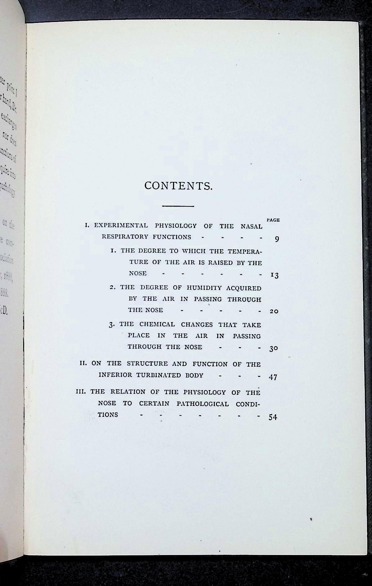 The work is structured around laboratory experimentation, anatomical analysis, and clinical correlation. Macdonald devotes substantial attention to nasal airflow dynamics, turbinate function, humidity regulation, and temperature modulation—topics that would later become foundational to modern otolaryngology and respiratory physiology.