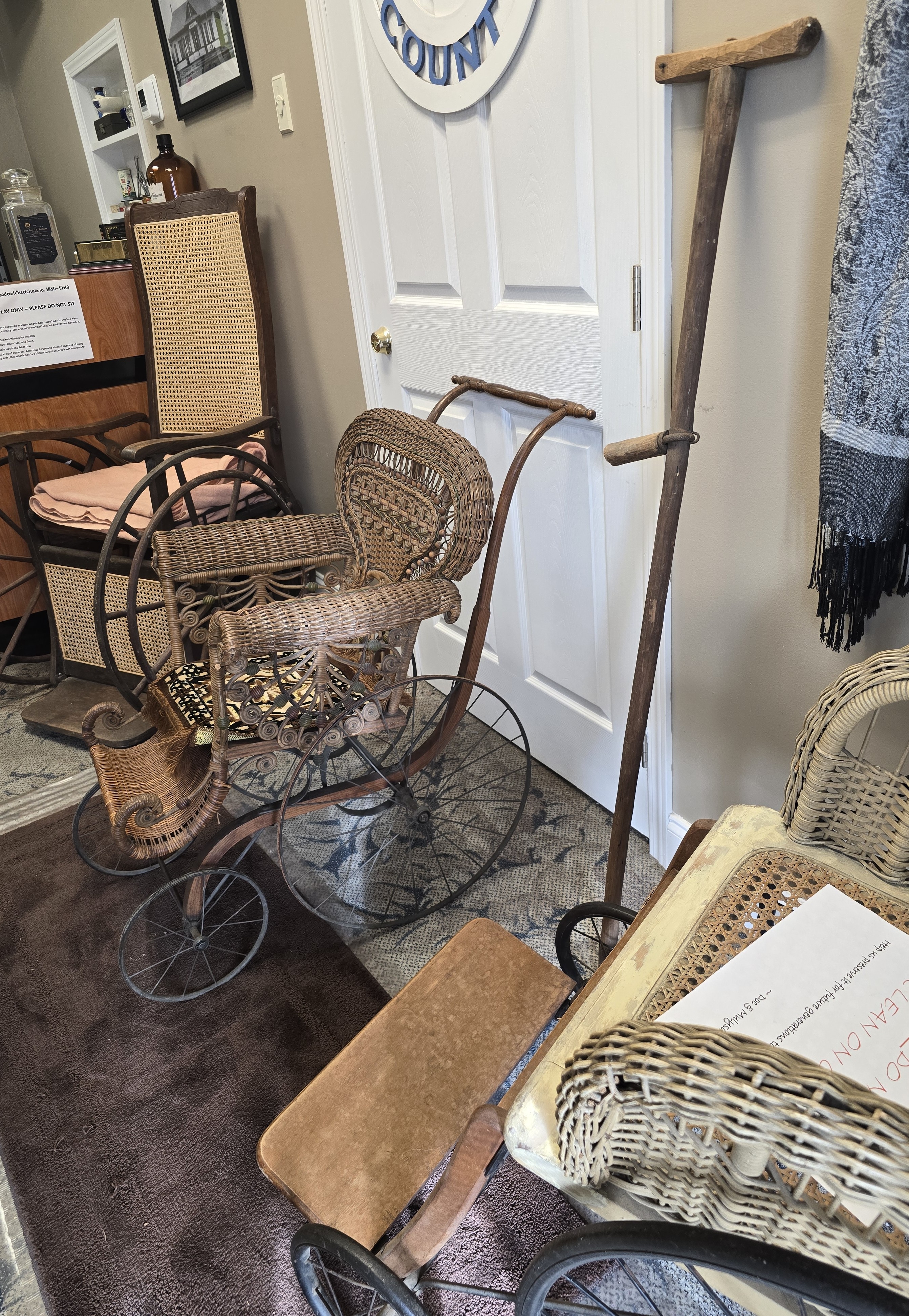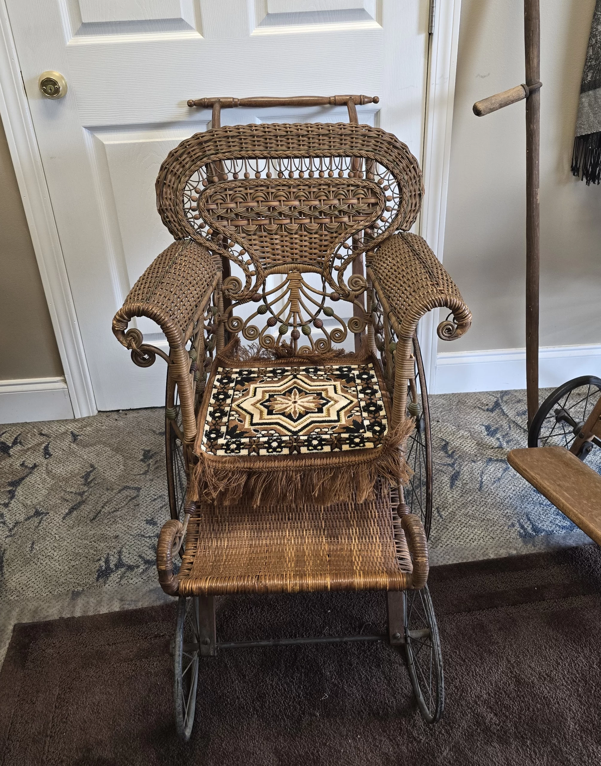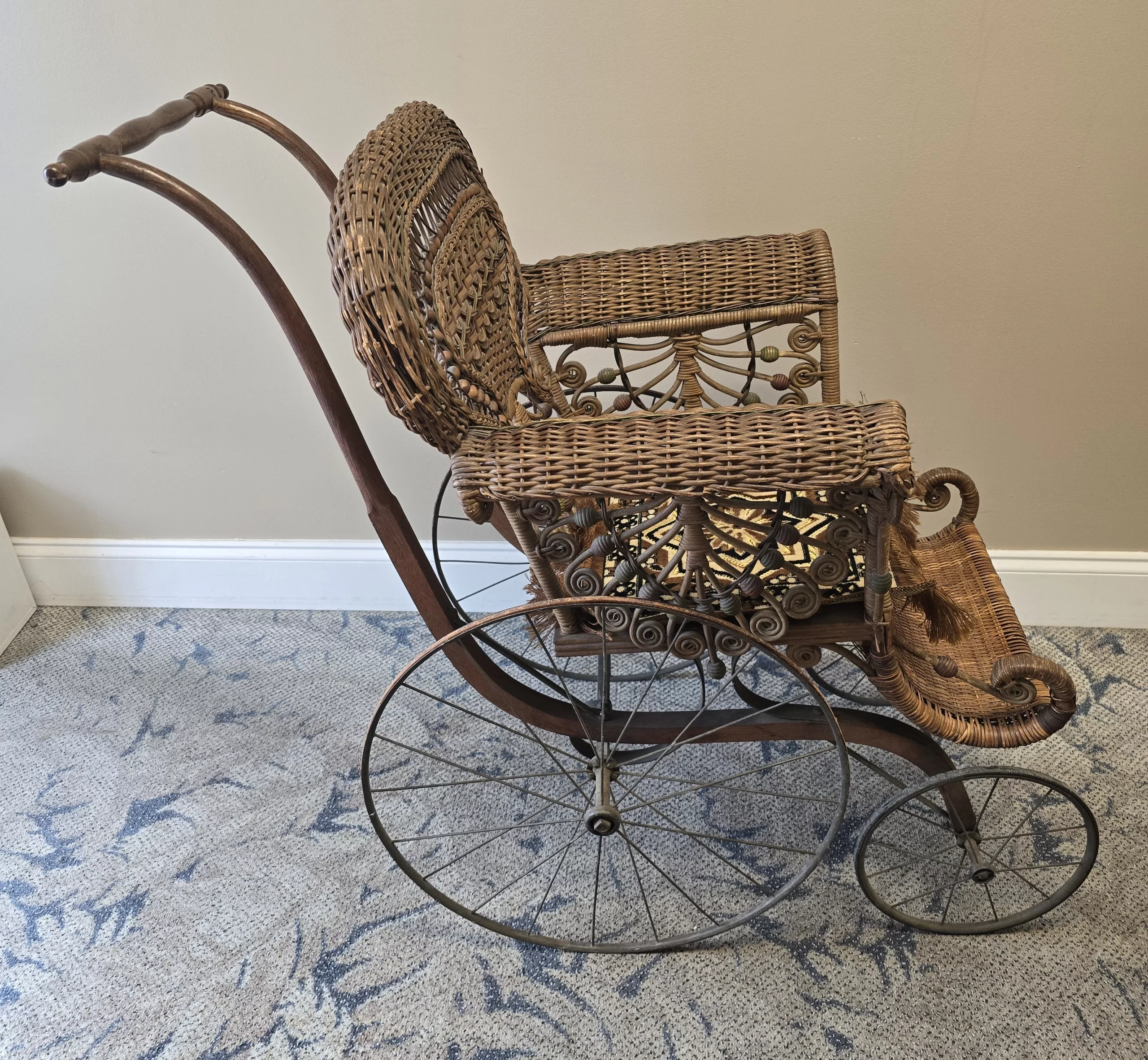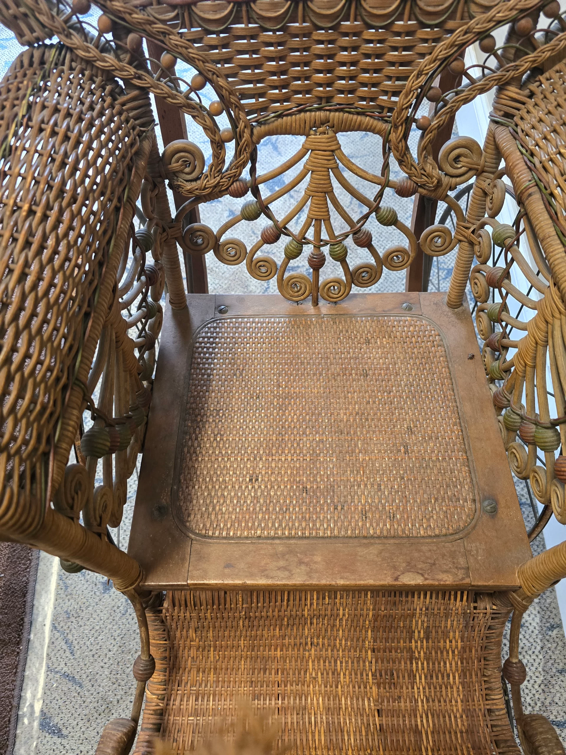 The elaborate curled wickerwork, decorative beading, and sculpted footrest indicate a higher-end model likely purchased by a middle- or upper-class household. The compact scale confirms its pediatric purpose: the seat measures approximately 12 inches by 12 inches, with an armrest height of 27 inches, dimensions appropriate only for a child or a very small, severely frail adult. Surviving examples of pediatric invalid chairs are far less common than adult versions, as they were produced in smaller quantities and frequently discarded as families moved or as children outgrew them.