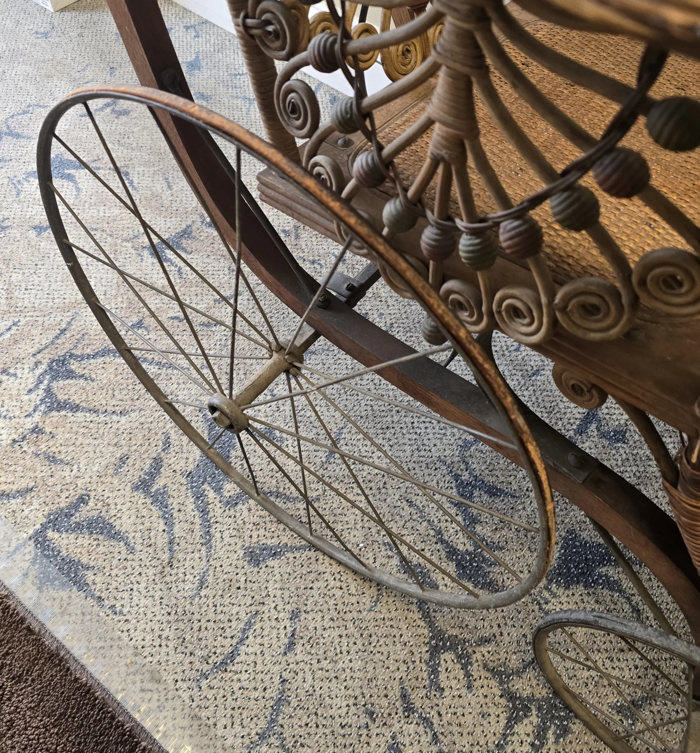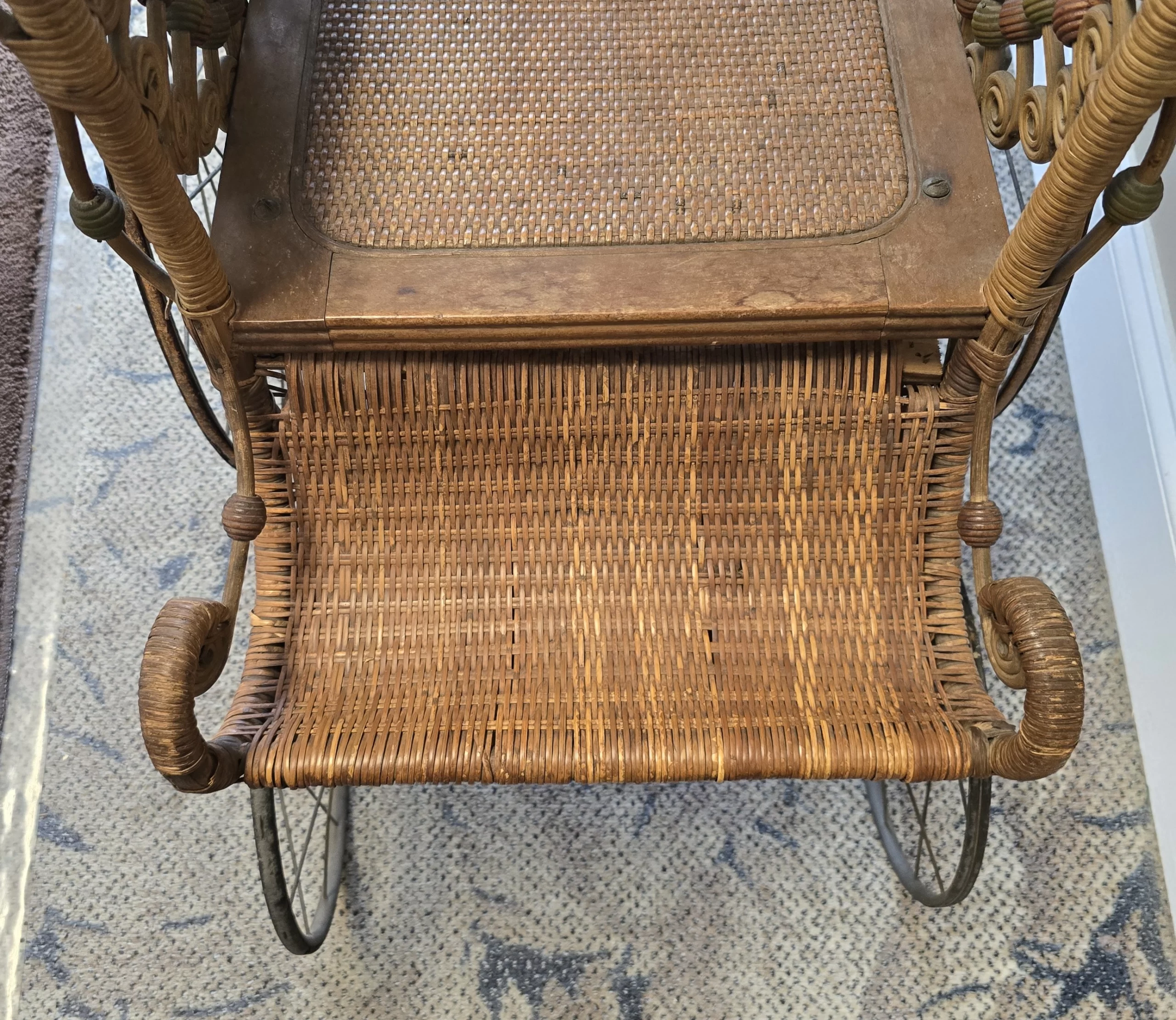 Overall excellent display condition with original wickerwork largely intact. Minor wear and small losses to wicker edges, oxidation to metal components, and expected age patina to wood. Seat cushion appears to be a later addition.