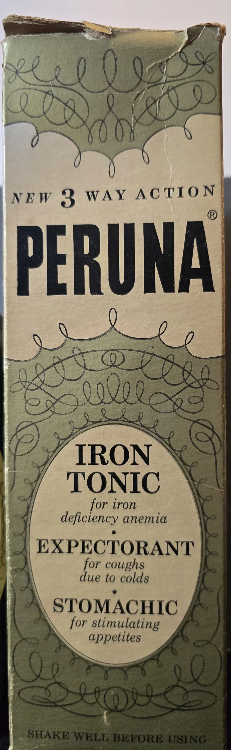 This boxed bottle of Peruna 3-Way Action represents the later evolution of one of America’s most notorious patent medicines. Originally launched in 1898 by Dr. Samuel B. Hartman of Columbus, Ohio, Peruna was first marketed as a cure for catarrh—a vague term covering nearly any chronic ailment. By the mid-20th century, after federal regulations curtailed unsubstantiated medical claims, Peruna re-emerged as a “Stomachic Iron Tonic and Expectorant,” boasting “New 3-Way Action” for appetite, anemia, and coughs due to colds.