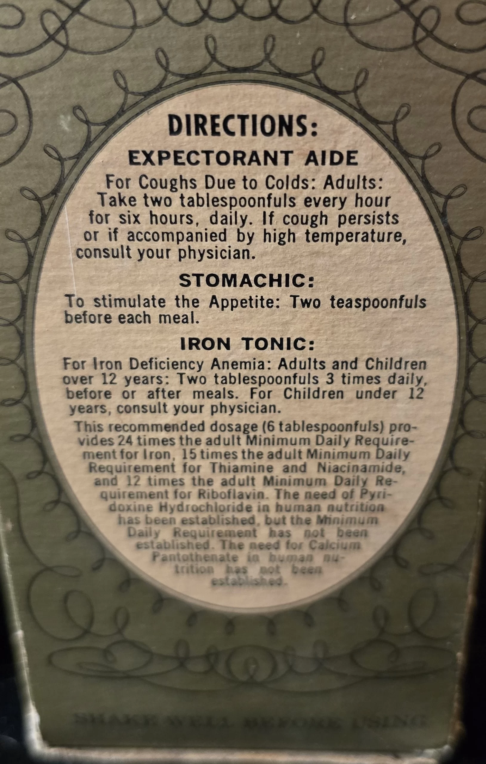 Iron Tonic for iron deficiency anemia · Expectorant for coughs due to colds · Stomachic for stimulating appetites.”