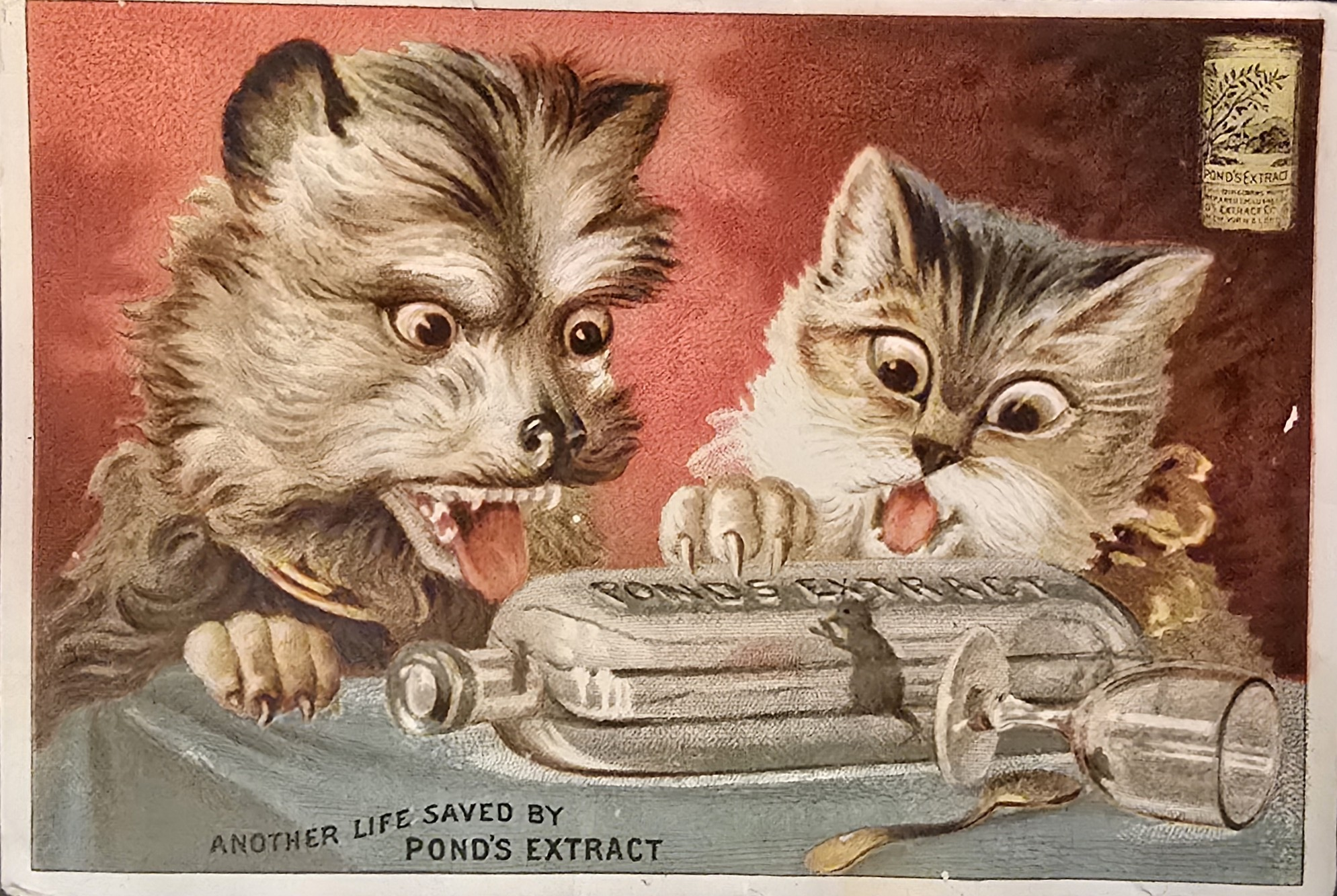 The companion illustration features a distressed kitten and puppy hovering over a spilled bottle with a mouse inside, captioned “Another Life Saved by Pond’s Extract.” The imagery reinforces the product’s branding as gentle, restorative, and safe enough for even the most vulnerable—an emotional appeal that was extremely effective in an era of limited regulation.
