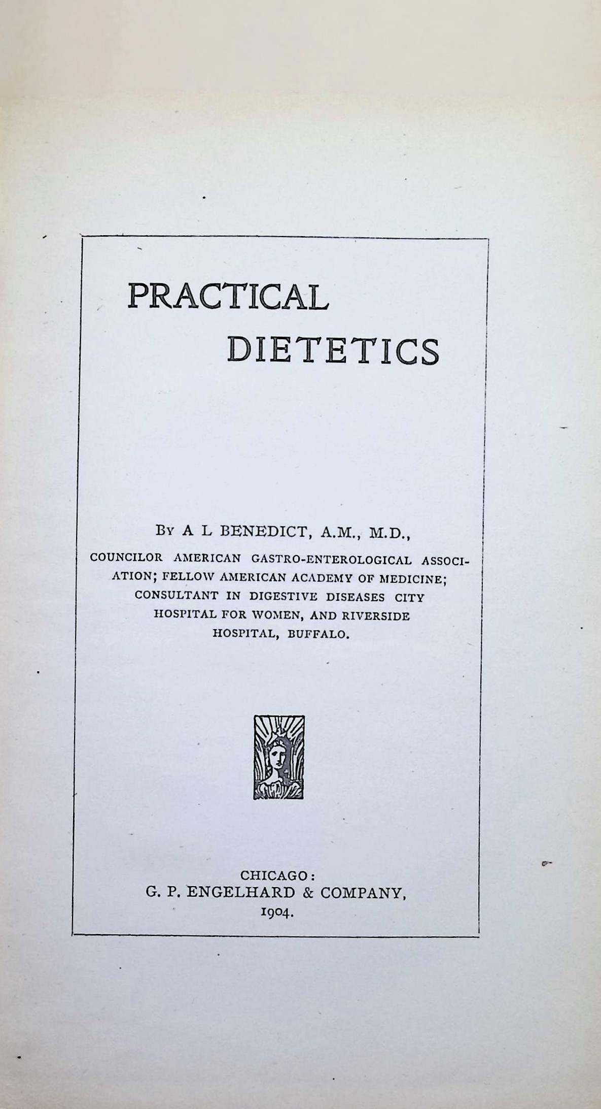 Practical Dietetics (1904) by Dr. A. L. Benedict is a comprehensive volume on the medical application of nutrition, offering early 20th-century clinical advice on digestion, metabolism, obesity, fever nutrition, and emergency feeding. Dr. Benedict — a gastroenterologist, lecturer, and hospital consultant — provides both biochemical theory and prescriptive dietary interventions suited to physicians and dietitians working in hospital settings.