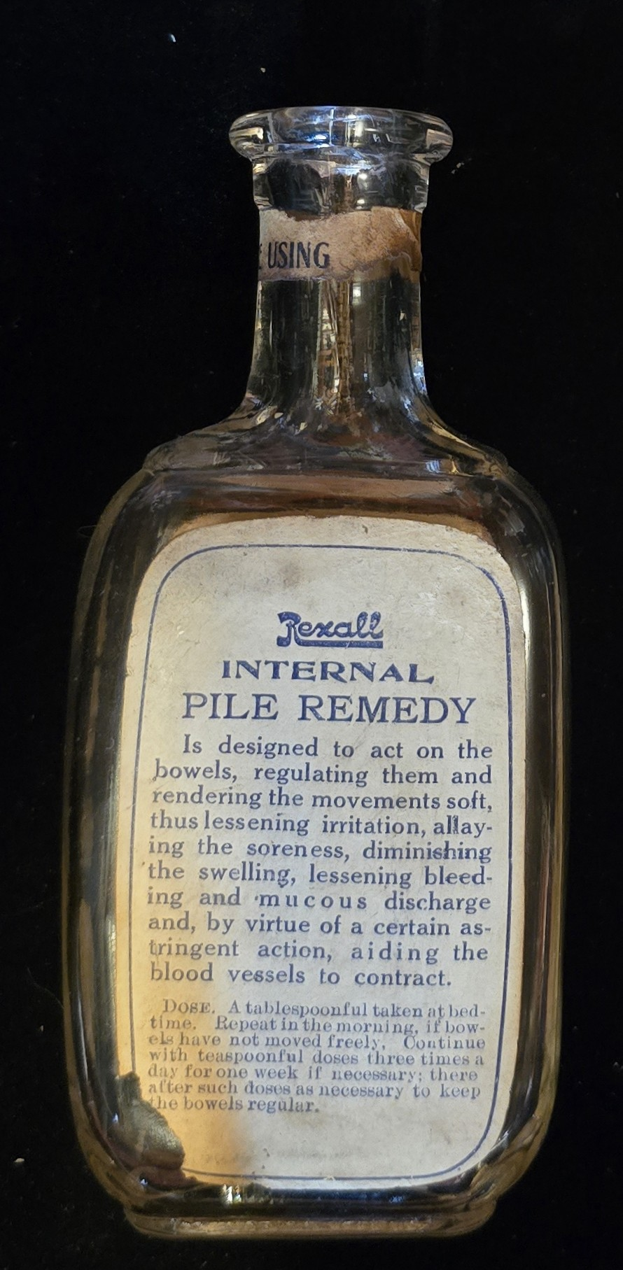 Rexall Internal Pile Remedy was an over-the-counter liquid formula sold to treat “piles,” the period term for hemorrhoids. The label promises relief from pain, swelling, soreness, bleeding, mucous discharge, and irritation. It claims to work in two ways: first, by “regulating” the bowels and making the stool soft so patients wouldn’t aggravate inflamed hemorrhoidal tissue; and second, by an internal astringent effect that would “aid the blood vessels to contract,” theoretically shrinking the hemorrhoids from the inside.