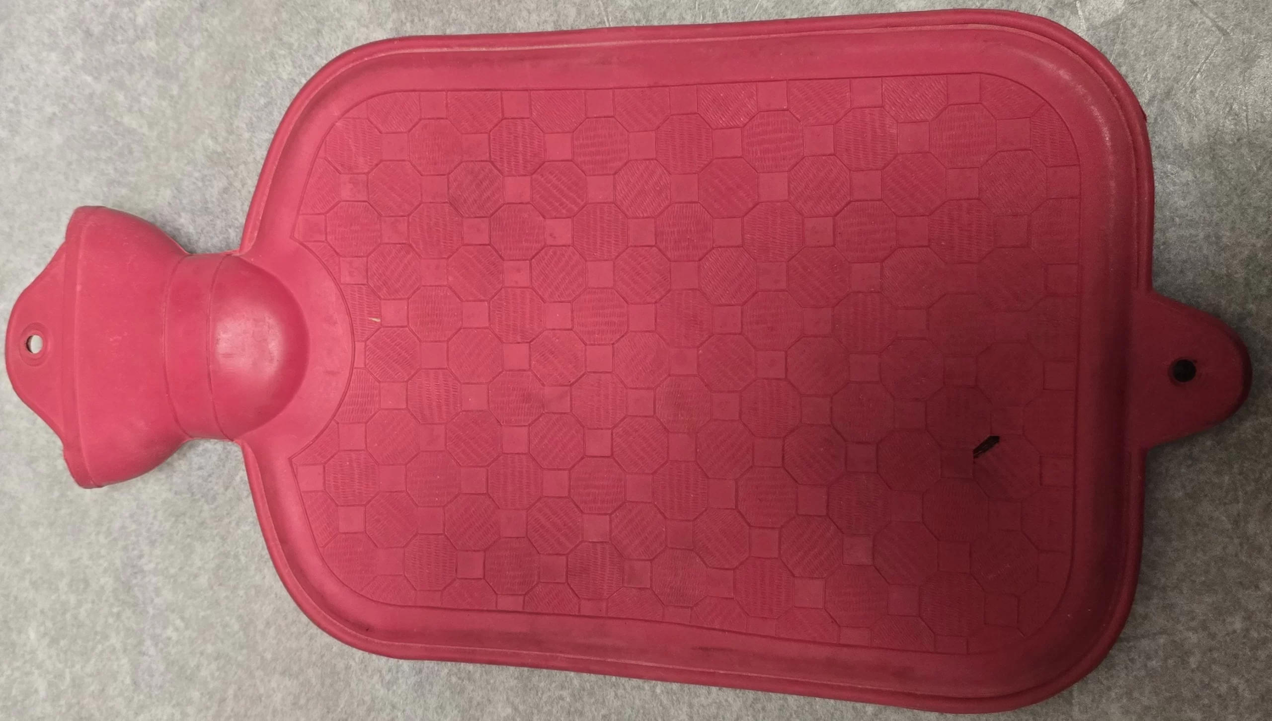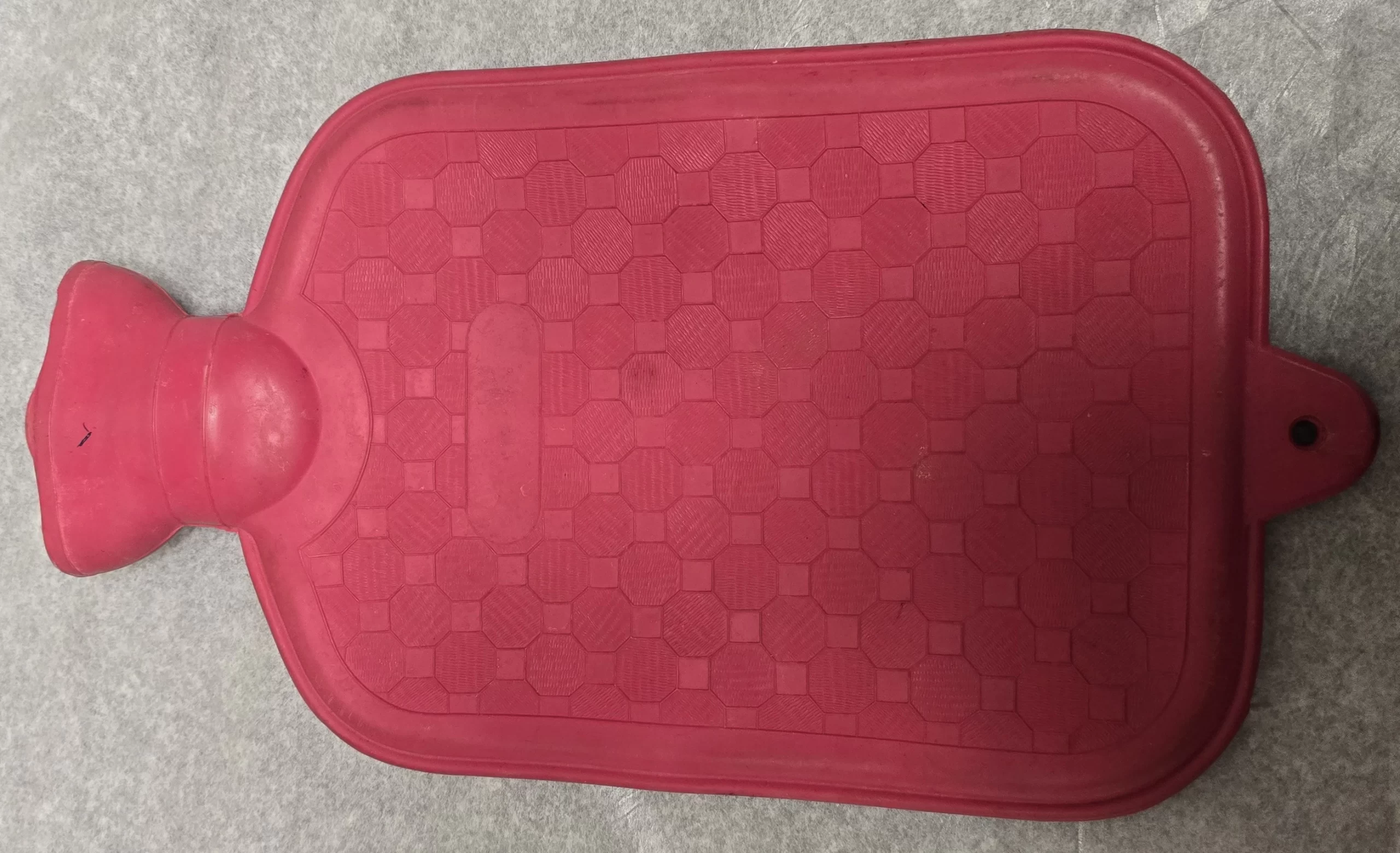 With its raised hex-octagonal texture and red coloration, this design is characteristic of mid-century mass-produced models. It lacks manufacturer branding but was likely a generic drugstore or medical-supply item. The puncture and worn rubber speak to its long use—perhaps in a home medicine cabinet, or tucked beside a loved one on a chilly night.