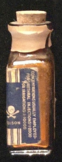 This small amber glass bottle once contained Silvogon, a gonococcocide produced by the Ernst Bischoff Co. of New York in the late 19th century. Each bottle held tablets weighing 2½ grains each, which were dissolved in water to prepare antiseptic solutions. The label prominently warns with a skull-and-crossbones and the word Poison.