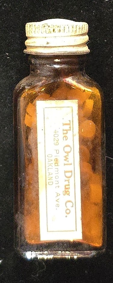 Owl Drug was a West Coast chain famous for its owl logo and soda fountains — this bottle’s side label anchors it to their Oakland shop on Piedmont Ave.