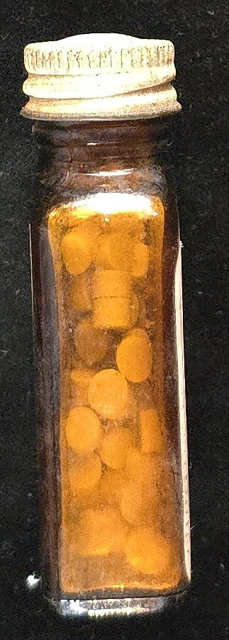 Very good for age: strong amber color, readable labels with minor edge wear, oxidation on cap, tablets intact. No cracks or chips observed. Standard age-related dusting inside cap and light label toning.