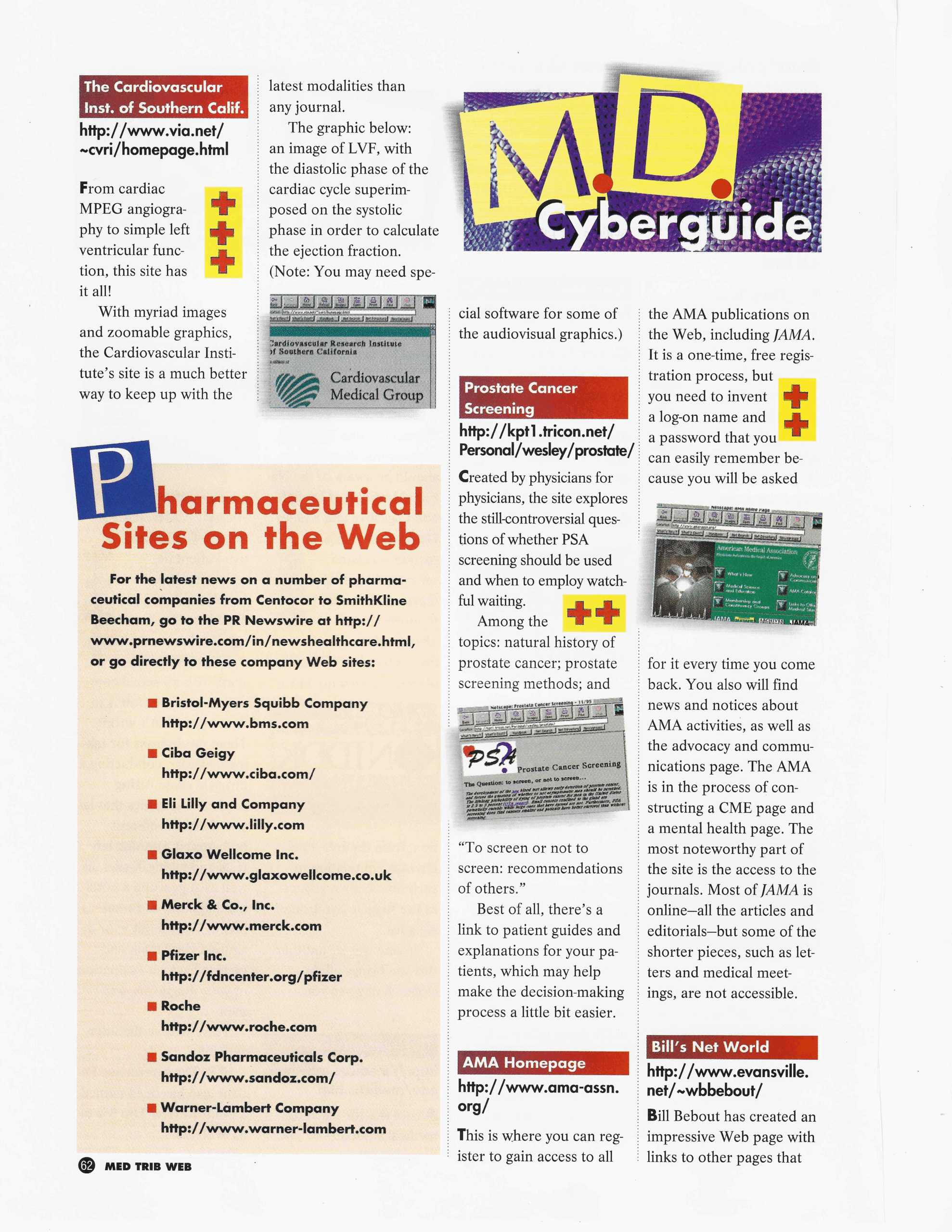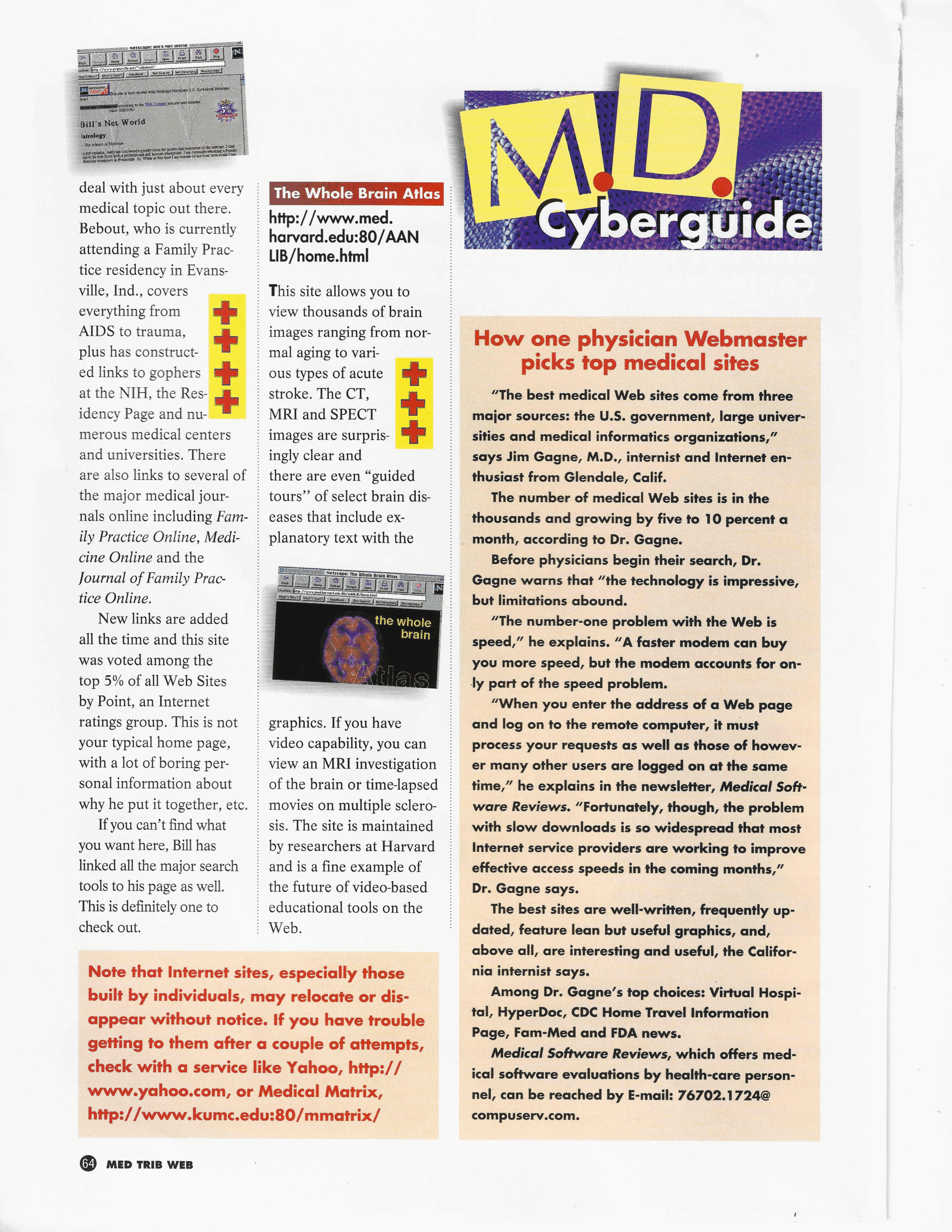 Until one day in April 1996, I was flipping through a medical publication I subscribed to called Medical Tribune. They had a quarterly supplement called Med Trib Web—a guide to online resources for physicians. I’m flipping through the “M.D. Cyberguide” section, and my jaw drops.