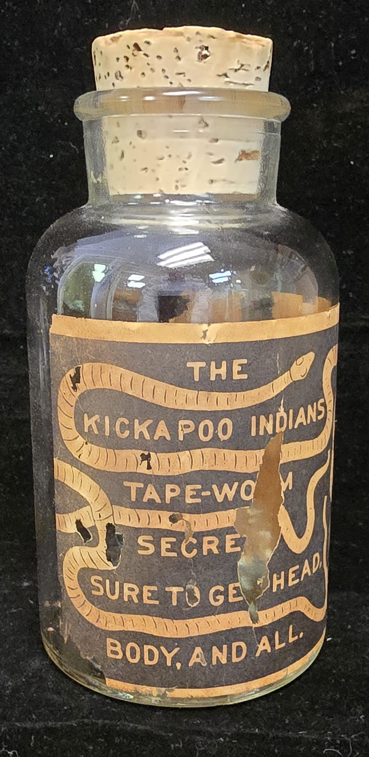As a display piece, this bottle captures the mix of fear, spectacle, and shameless advertising that defined the patent medicine era. Rather than presenting a sober pharmaceutical identity, it leans fully into theatrical marketing. The label was designed to grab attention immediately and to play on one of the most visceral anxieties a patient could have: the idea of harboring a tapeworm.