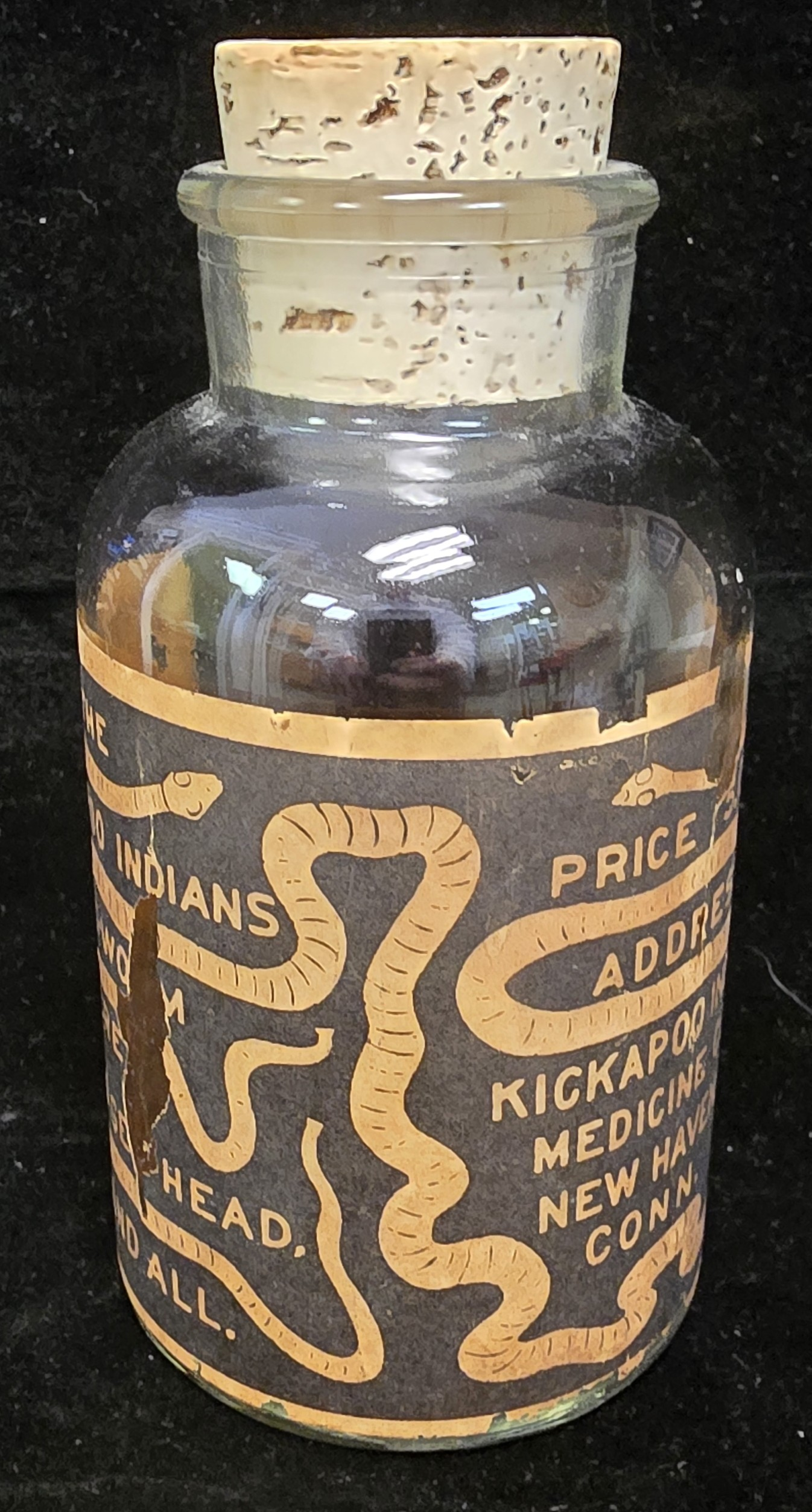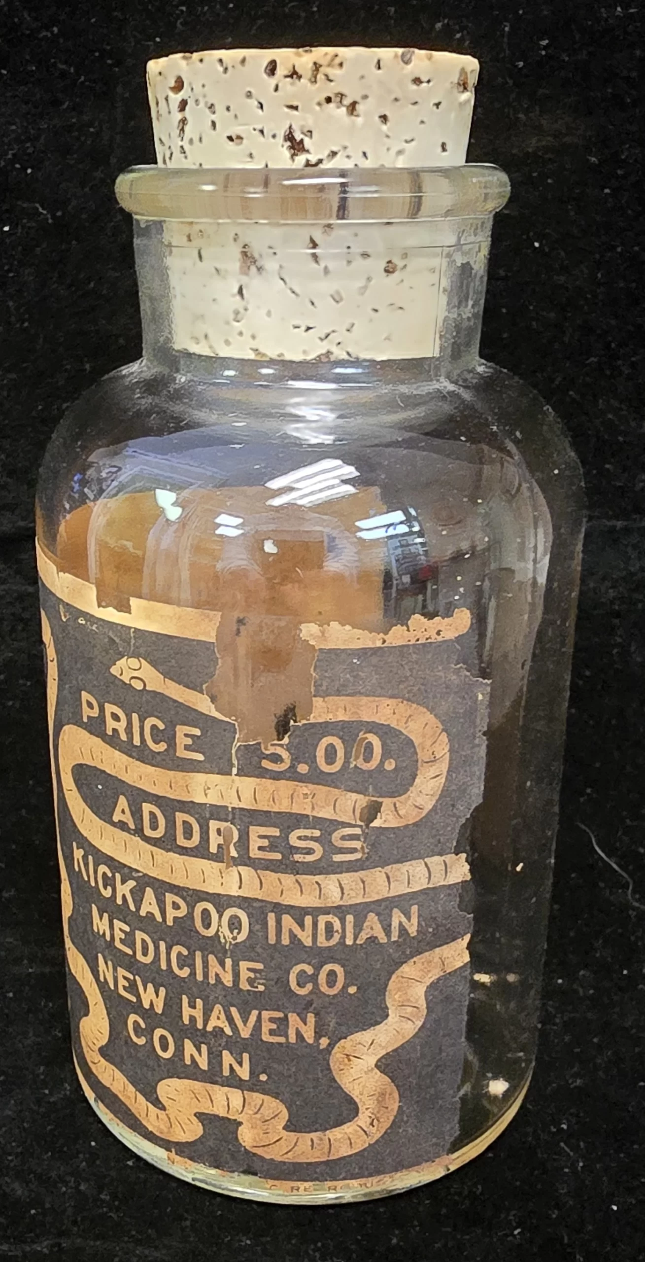 This is an original paper-labeled bottle for The Kickapoo Indians’ Tape-Worm Secret, produced by the Kickapoo Indian Medicine Company of New Haven, Connecticut. The bottle is clear glass with a broad-shouldered apothecary form, wide mouth, and cork stopper. Its surviving wraparound label is visually striking, featuring stylized worm imagery and the bold sales claim that the remedy was “Sure to get head, body, and all.” Another notable detail is the printed price of $5.00, prominently displayed on the label.