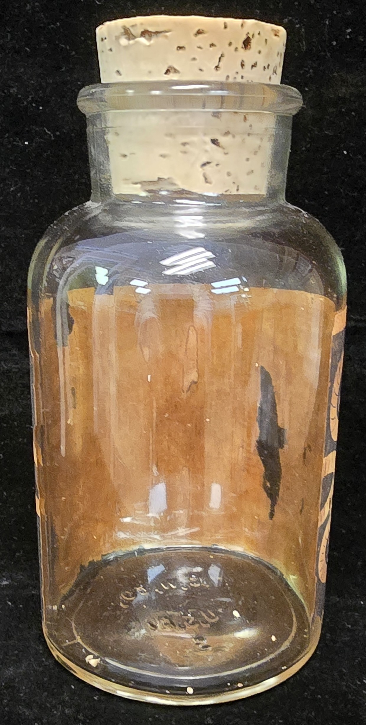 Clear glass bottle with surviving original paper label and cork stopper. Label shows noticeable loss, rubbing, edge wear, and age toning, but remains highly legible and visually strong for display. Bottle itself appears structurally sound with expected age wear.