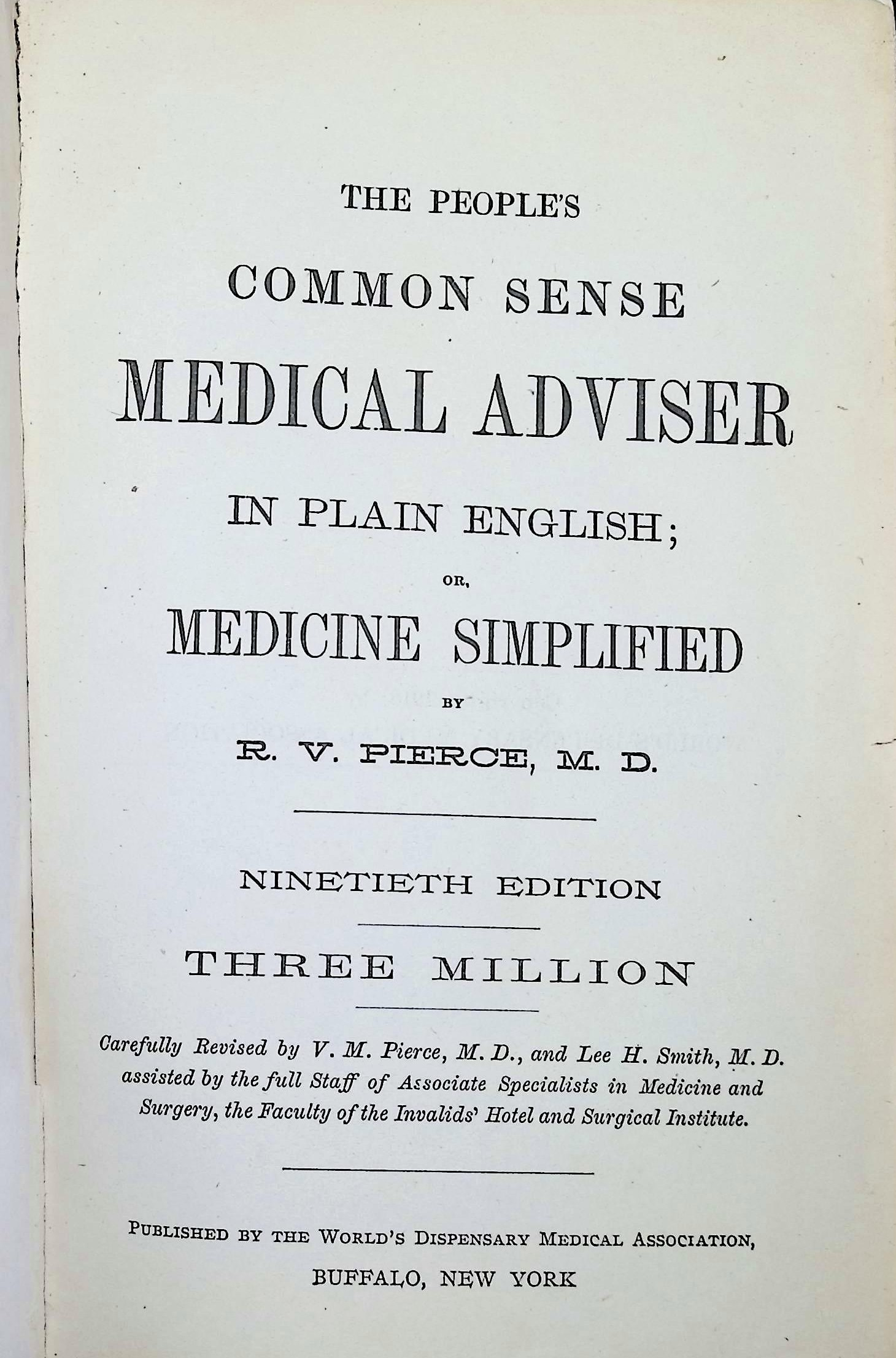 This is a 1918 edition of The People’s Common Sense Medical Adviser, authored by Dr. Ray Vaughn Pierce, a physician and entrepreneur from Buffalo, New York. Published by the World’s Dispensary Medical Association, this volume represents the ninetieth edition, with claims of three million copies in circulation.