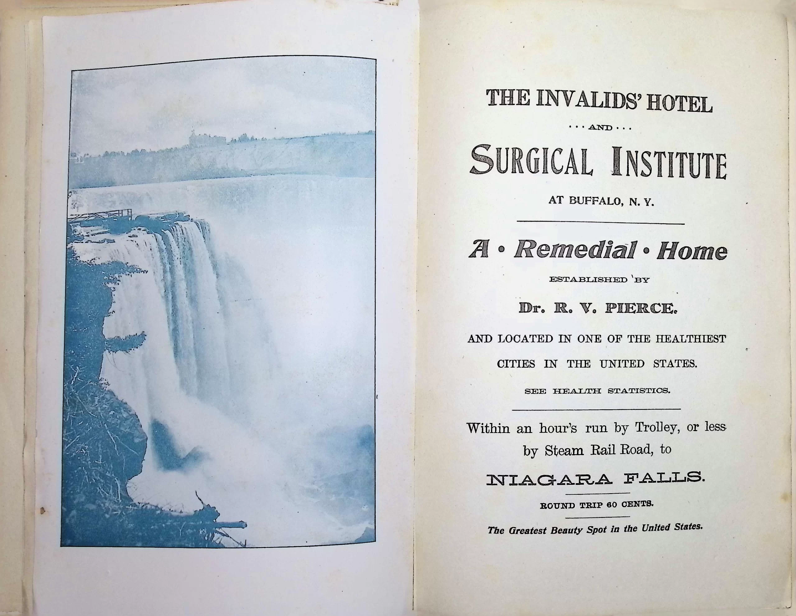 Dr. Pierce also operated the Invalids’ Hotel and Surgical Institute in Buffalo, NY—a “remedial home” and marketing hub for his proprietary remedies. The book features endorsements for the institute, portraits of Dr. Pierce and associates, illustrated anatomical and botanical plates, and chapters covering everything from love and marriage to narcotic drugs and cardiac disease.