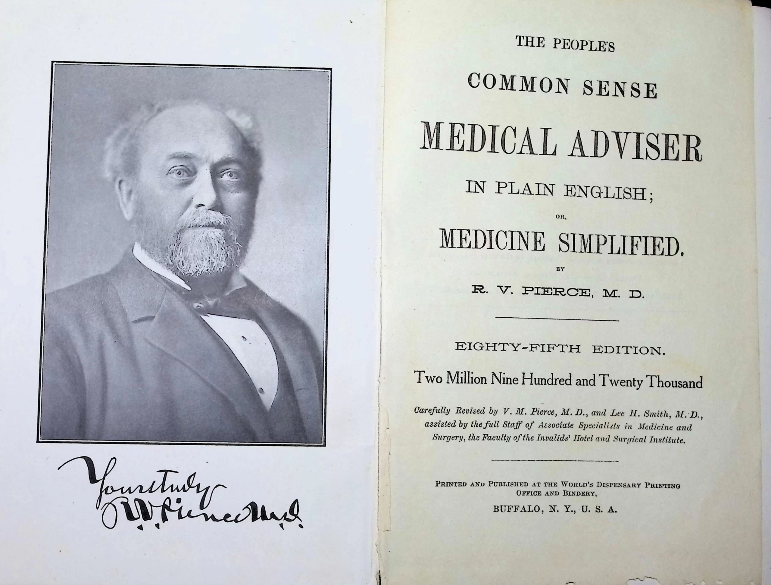 Published originally in 1875 and revised continually into the early 20th century, The People’s Common Sense Medical Adviser by Dr. Ray Vaughn Pierce was one of the most widely distributed self-help medical books of its era. Pierce—a Buffalo-based physician, businessman, and U.S. Congressman—was both a medical entrepreneur and a prolific promoter of patent medicines. He operated the Invalids’ Hotel and Surgical Institute, a medical resort-meets-quackery headquarters, and sold widely advertised remedies such as:
