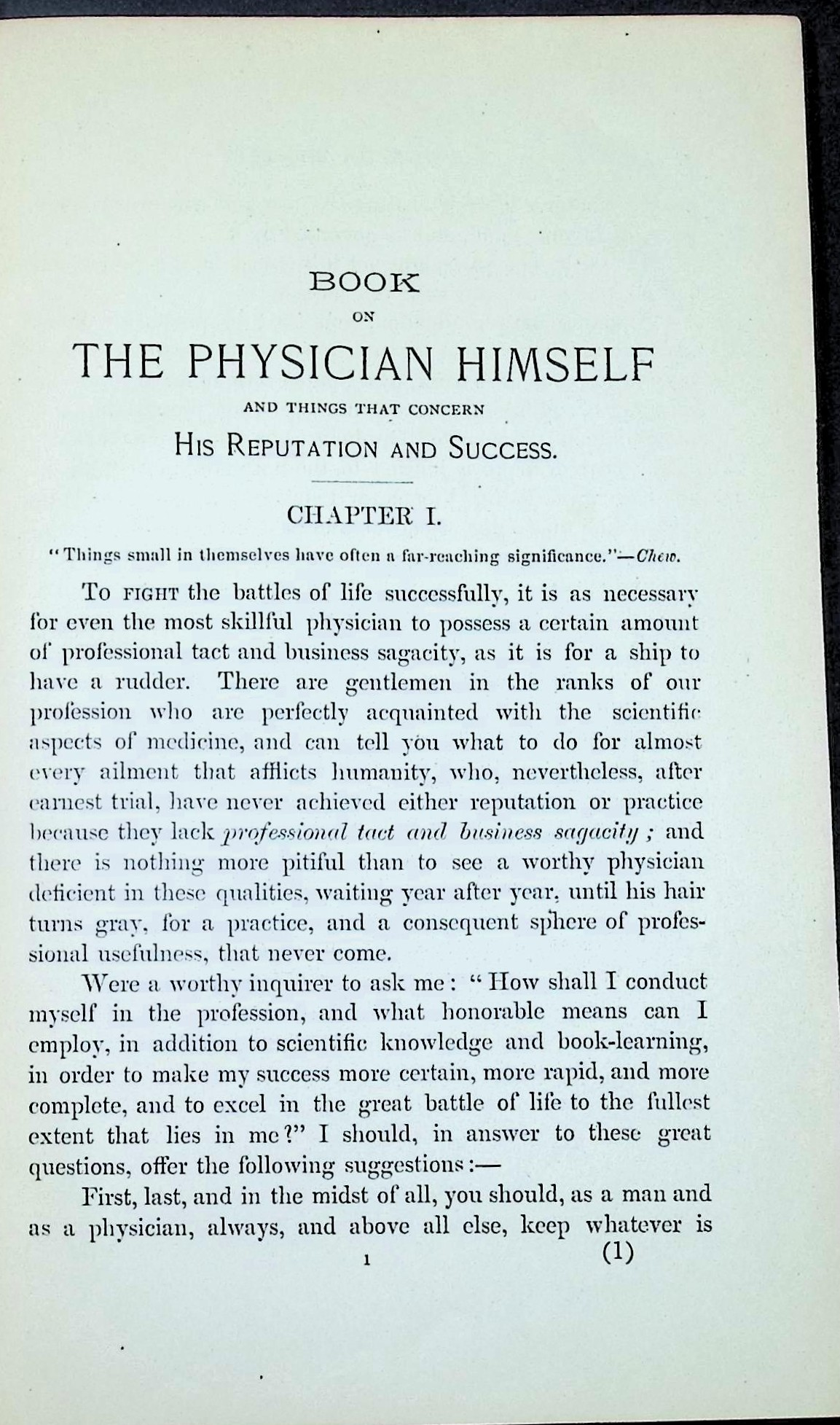 This volume, titled The Physician Himself and Things That Concern His Reputation and Success, was authored by Dr. Daniel Webster Cathell (1839–1908) of Baltimore, Maryland. It served as one of the earliest guides to medical professionalism and practice management in the United States, advising young physicians not merely in clinical conduct but in manners, ethics, and reputation.
