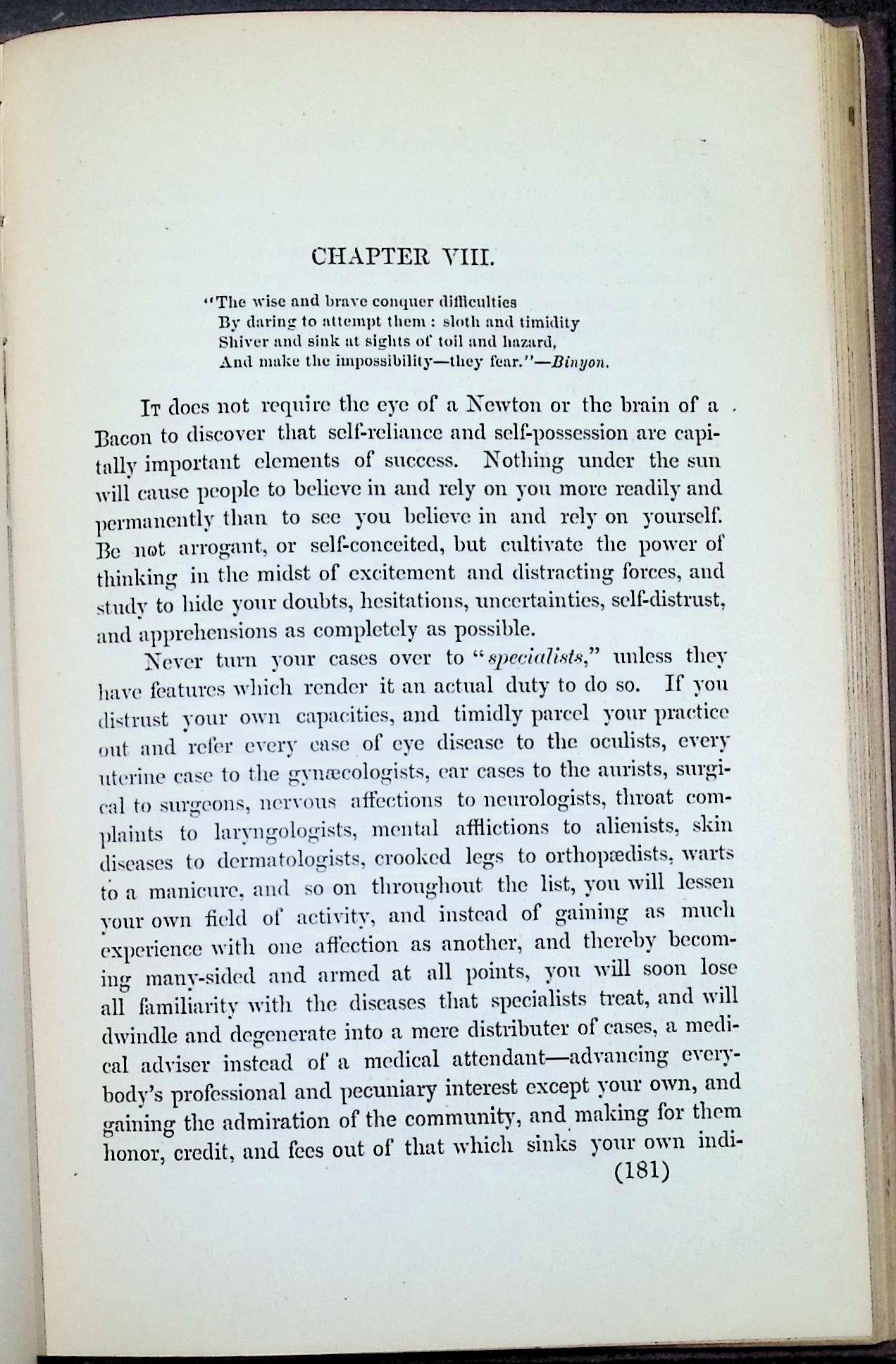 The book reflected the late Victorian ideal of the physician as a gentleman-scholar — sober, dignified, and respected. It warned against gossip, intemperance, and moral compromise, urging physicians to “fight the battles of life” with both science and self-control.