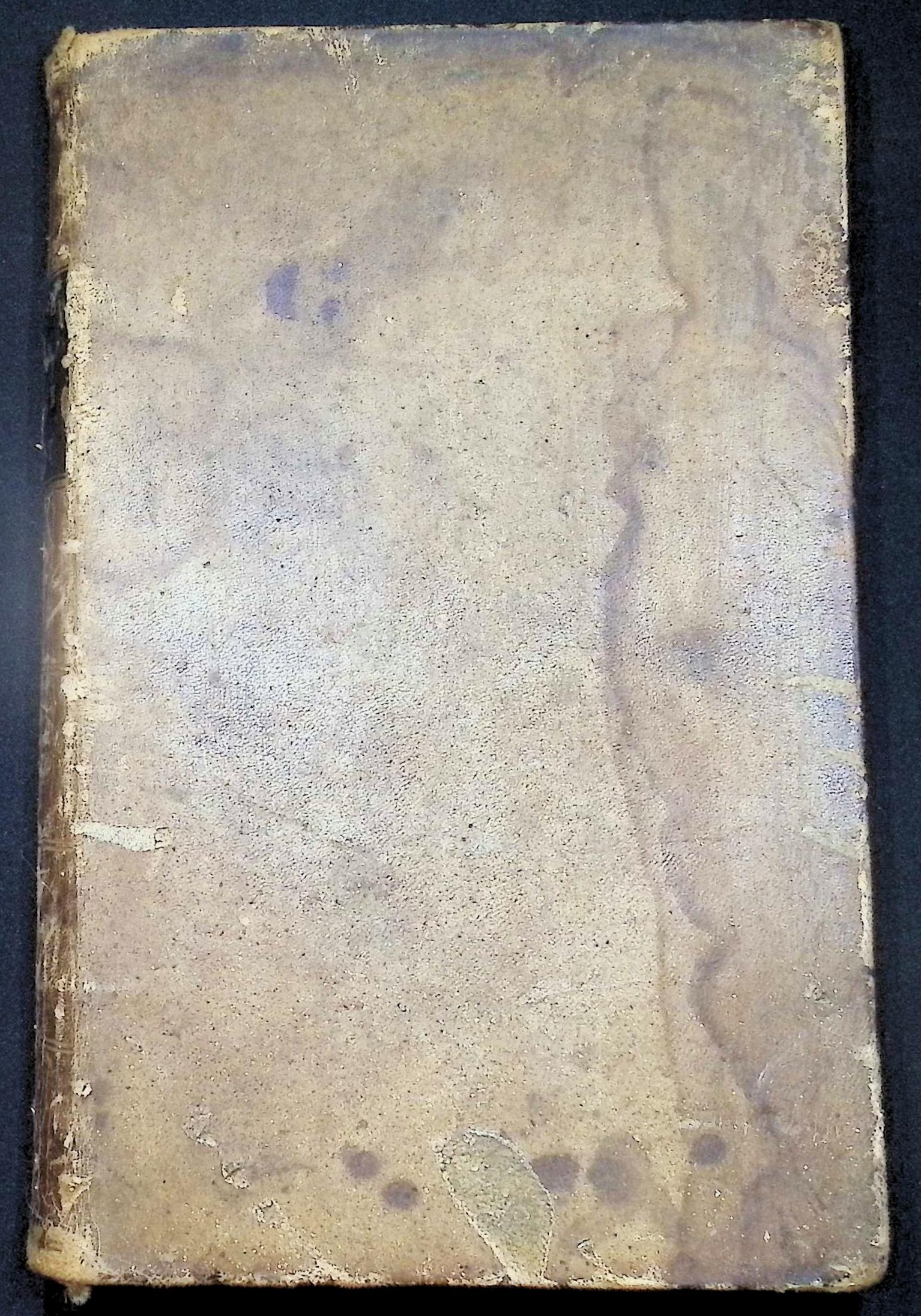 Original full leather binding, heavily worn with cracking, edge loss, and water staining. Spine label present but deteriorated. Interior pages largely clean and intact; engravings sharp. Binding weak but holding.
