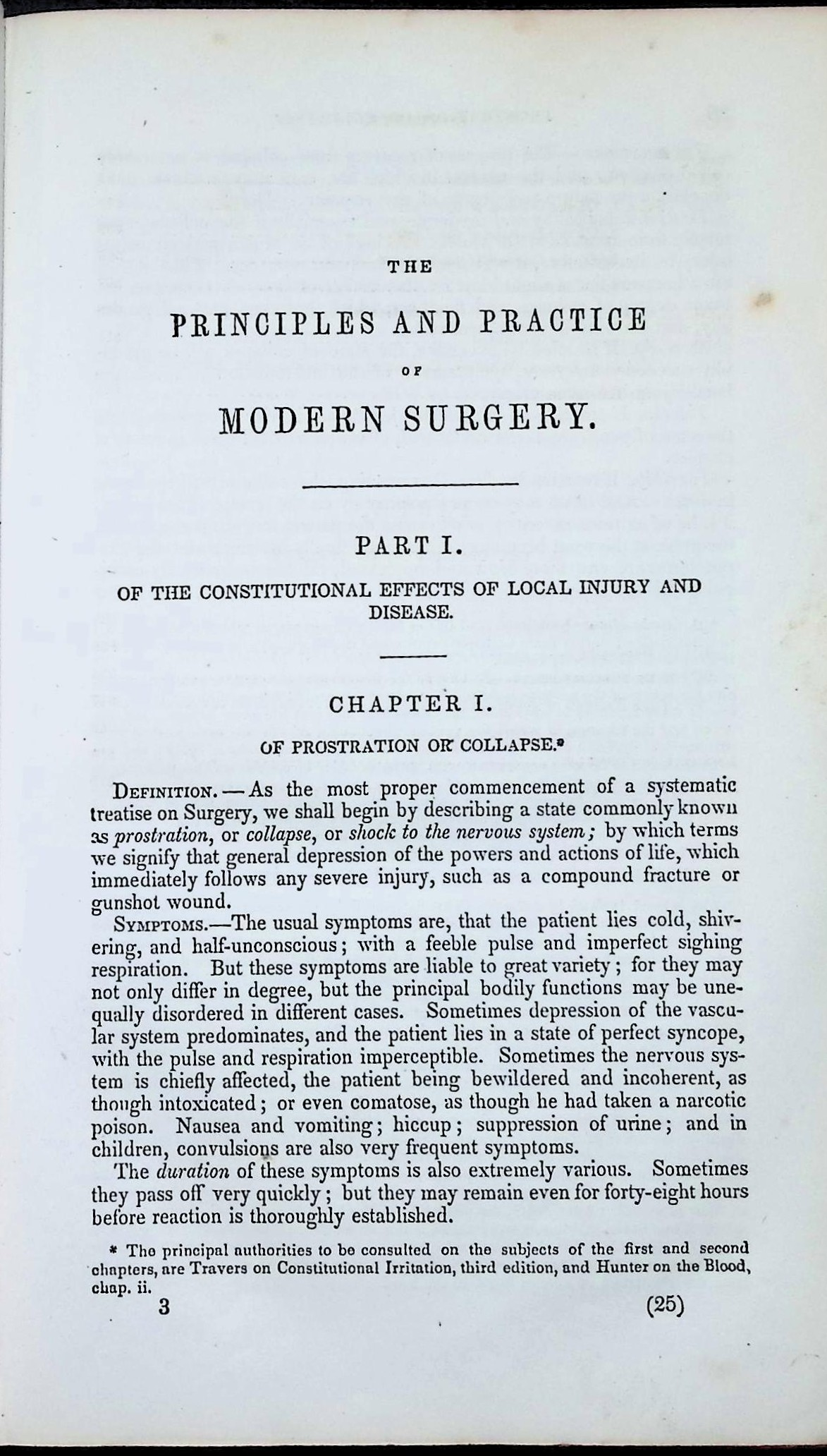 “As the most proper commencement of a systematic treatise on Surgery, we shall begin by describing a state commonly known as prostration, or collapse, or shock to the nervous system…”