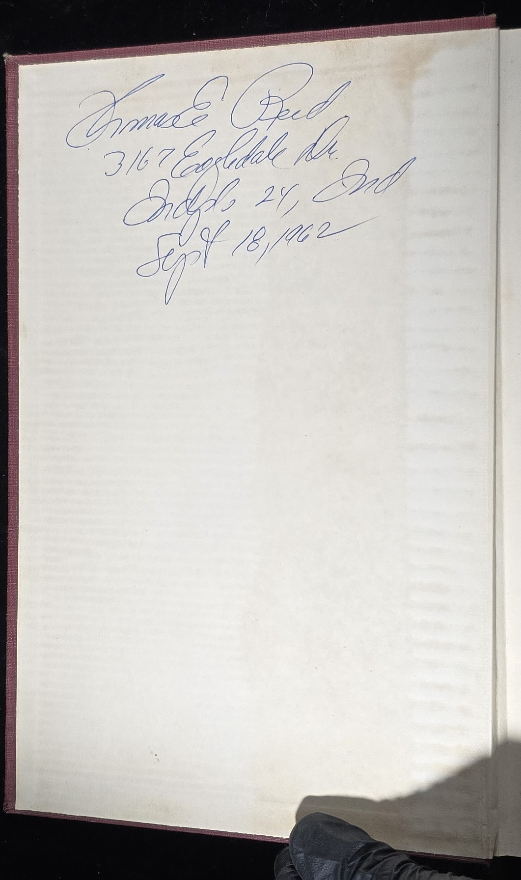 Red clothbound hardcover in very good condition with minor edge wear. Spine and covers remain intact and clear. Former owner’s inscription (Thomas E. Reid, 1962) and library discard stamp from IU School of Medicine Library dated Dec 2, 1992.