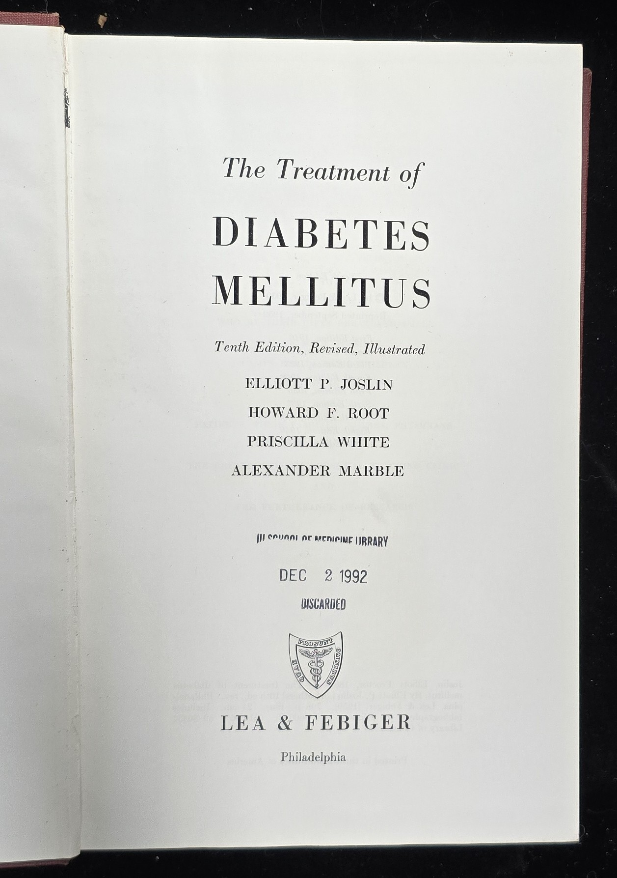 As a diabetic care milestone and a detailed clinical artifact from the late 1950s, this book reflects a pivotal era in chronic disease medicine. Its condition, provenance, and connection to both Joslin and the IU School of Medicine Library make it especially relevant to my personal and regional collection.