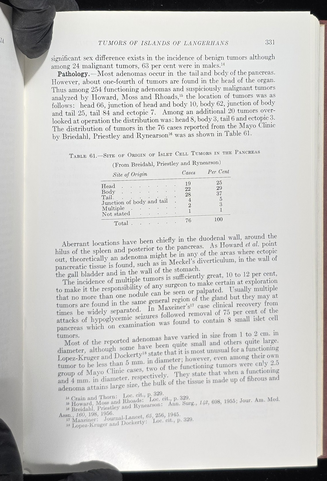 This volume contains one of the clearest early clinical mappings of islet cell tumors (see Table 61), including their frequency in different parts of the pancreas.