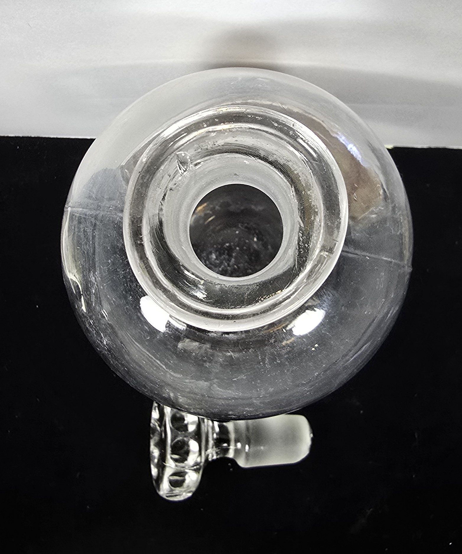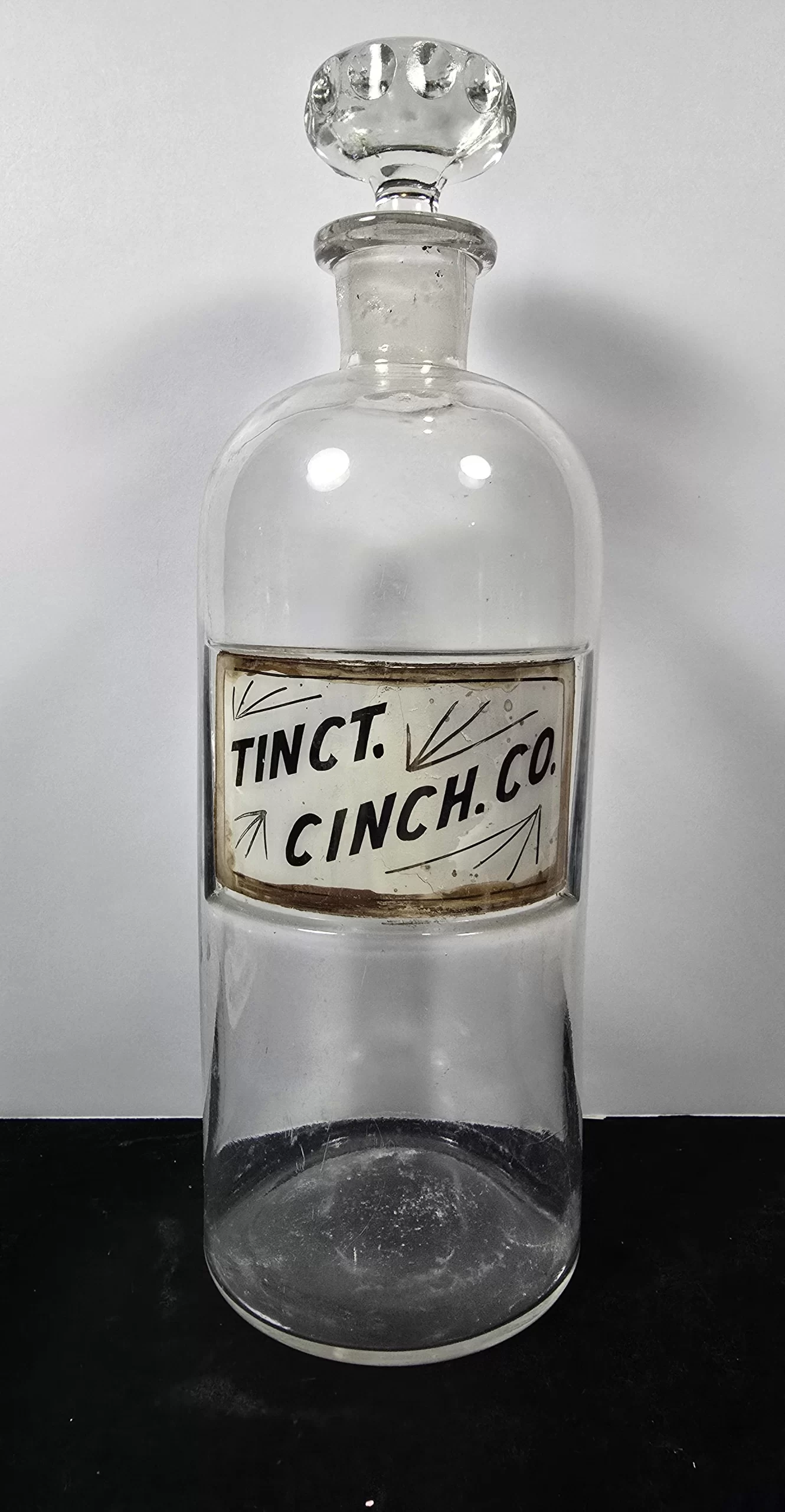 This is a tall, round clear-glass apothecary bottle with its original heavy glass stopper, labeled “Tinct. Cinch. Co.” The abbreviation refers to Tinctura Cinchonae Composita, or Compound Tincture of Cinchona.