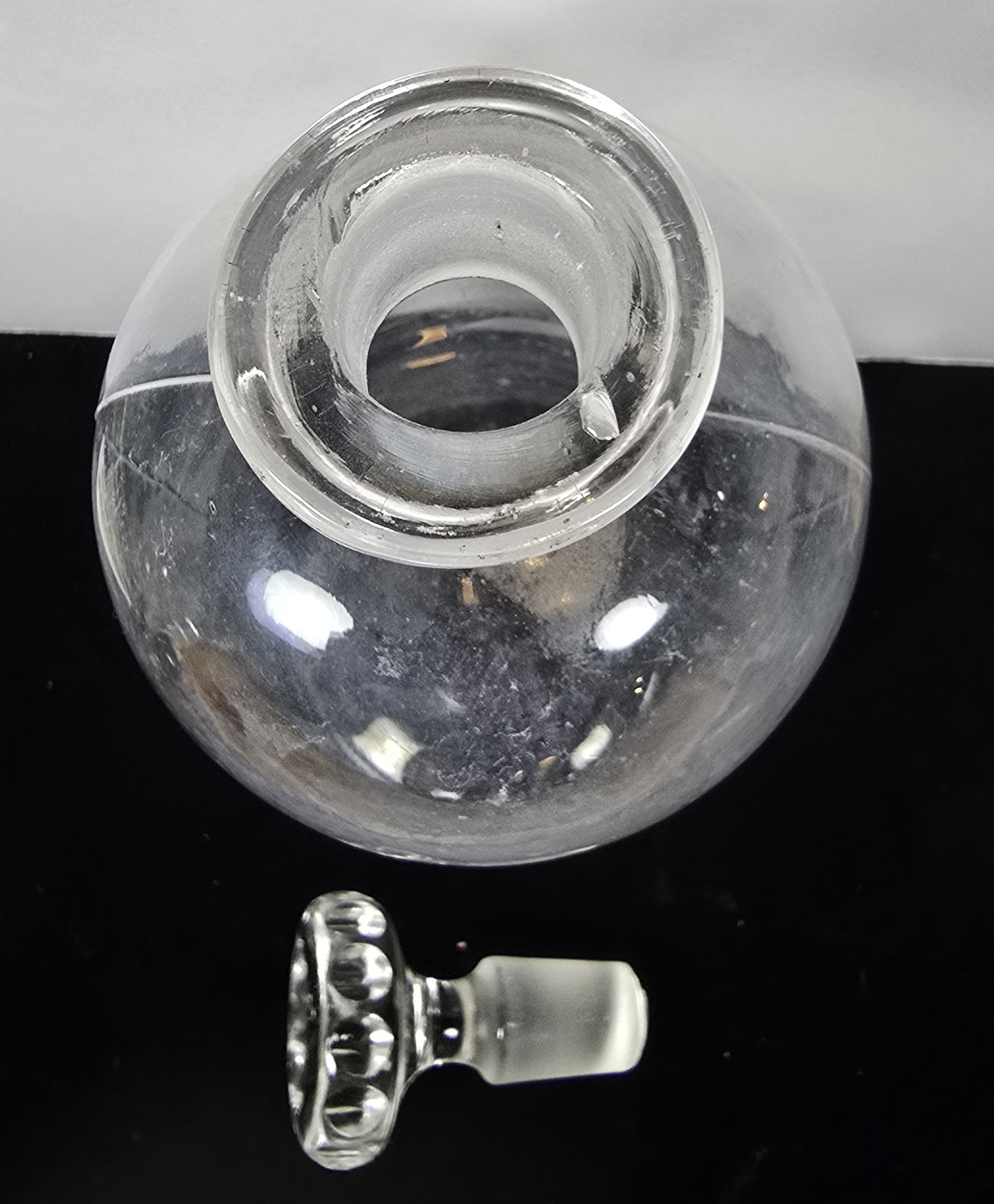 The bottle is in good antique condition with original stopper intact. The enameled/applied label shows discoloration, surface spotting, and age toning, but remains legible. The glass has light interior haze and shelf wear, but no major cracks or chips.