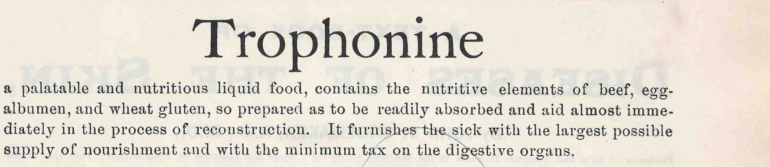 Vintage advertisement text for “Trophonine,” described as a palatable and nutritious liquid food containing beef, egg albumen, and wheat gluten.